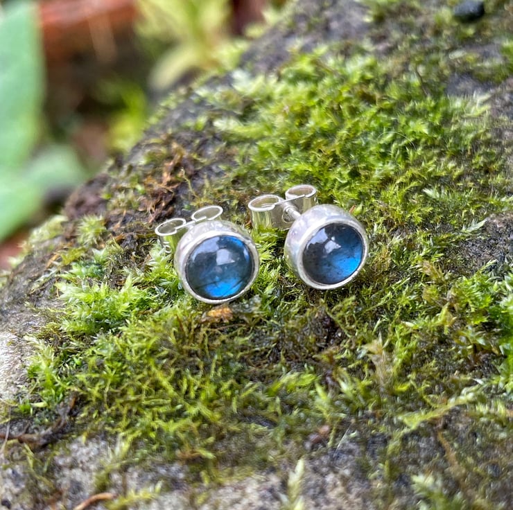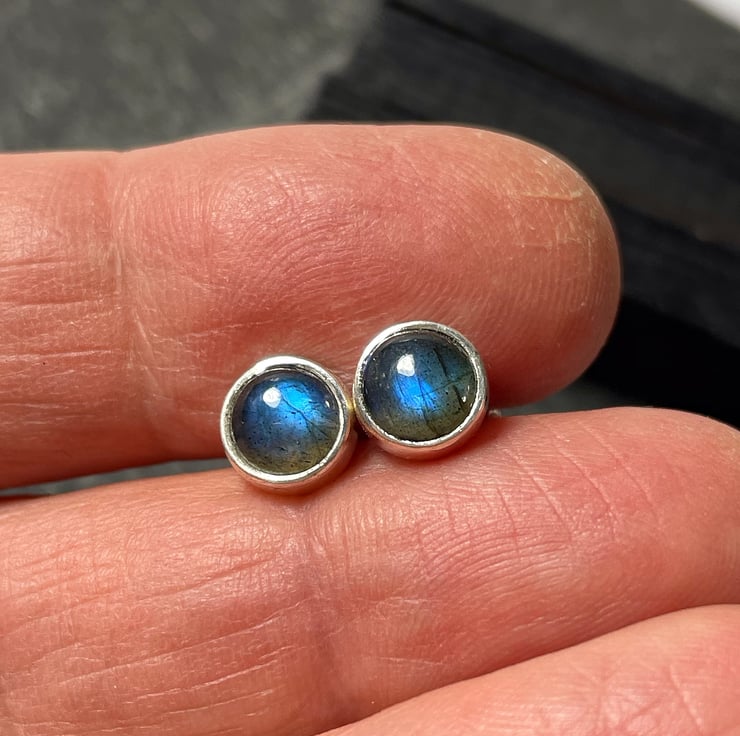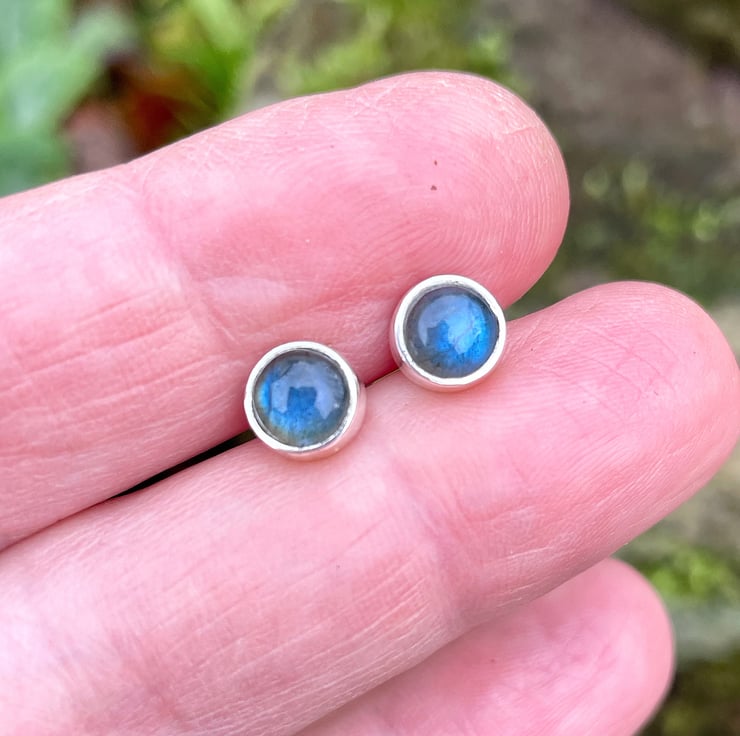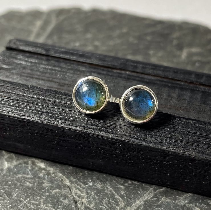 Simple small sterling silver stud earrings set with stunning flashy labradorite cabochons.