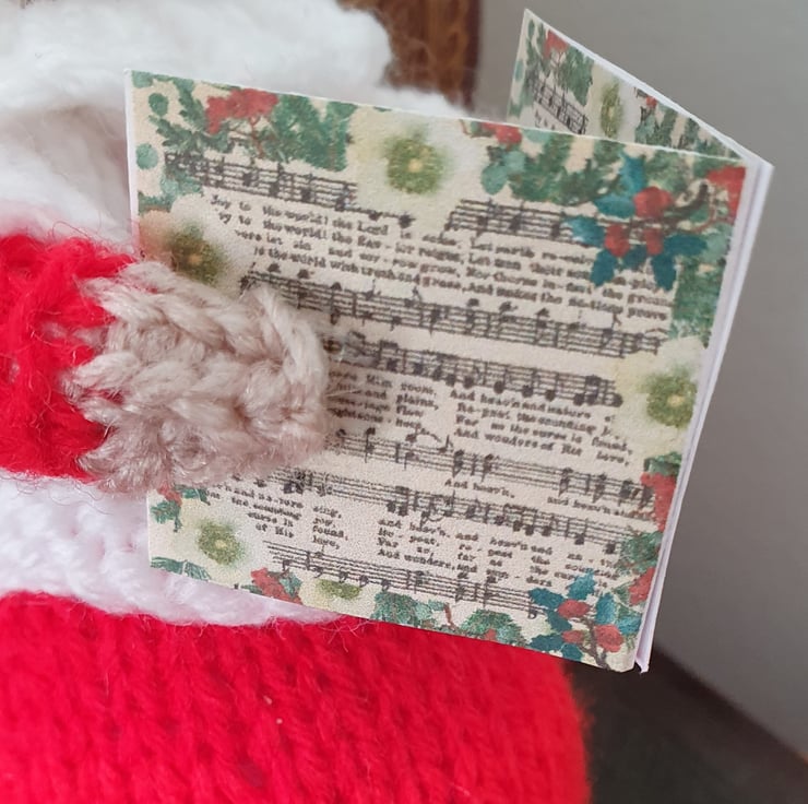 Measuring approximately 5" tall he is made in red with a white cassock and carries his music sheet.