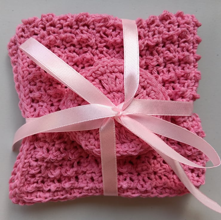 Crochet Flannel and Face Scrubbies (Pink) - reusable eco-cotton