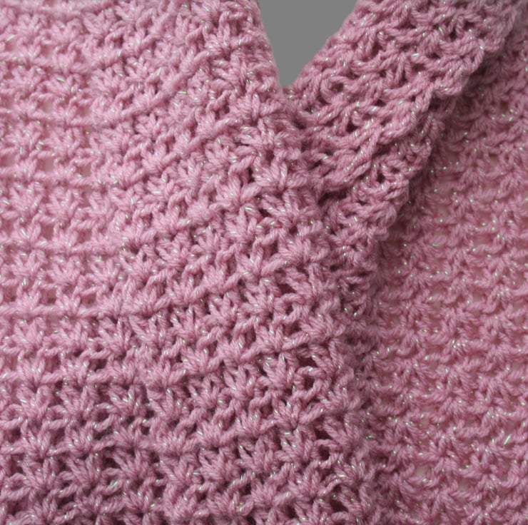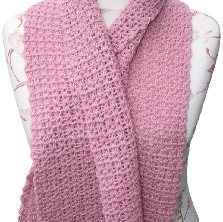 I was inspired to make a lovely scarf with this wool as it is soft and is a pretty Rose shade with a hint of sparkle throughout. It would be ideal for a festive party with it's hint of sparkle but it would also be ideal as a light-weight hint of colour on a Spring day.