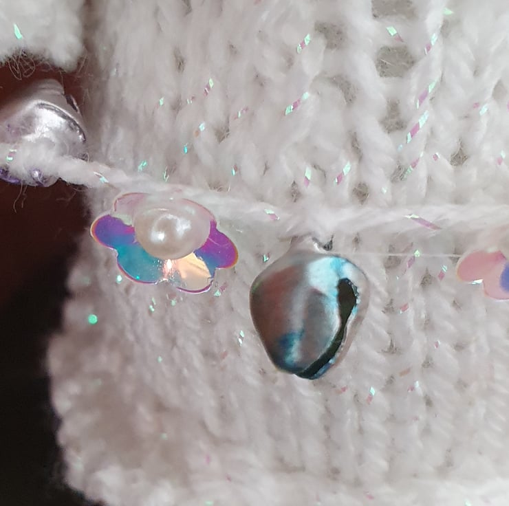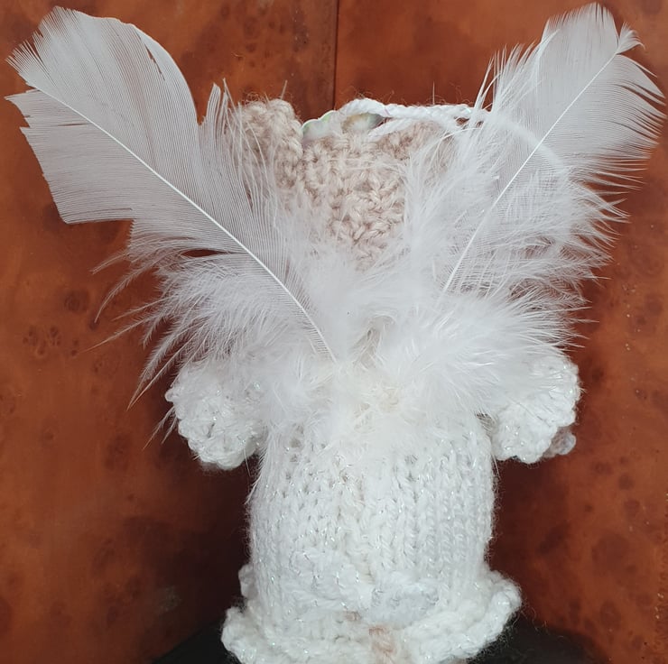 She is made in a sparkly white yarn and holds a string of pearly flowers and silver bells. Her wings are made of white feathers.