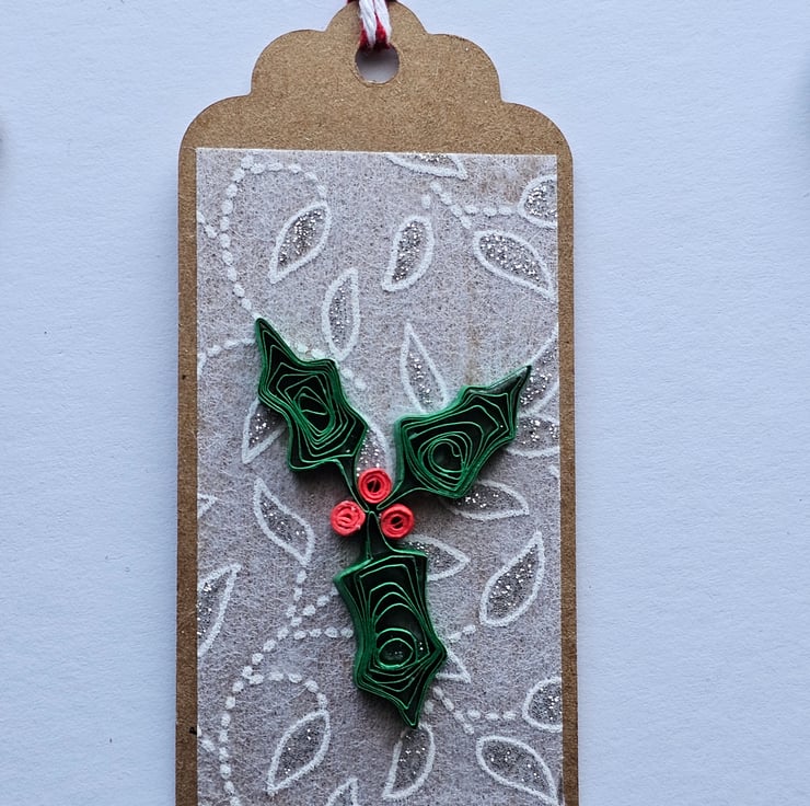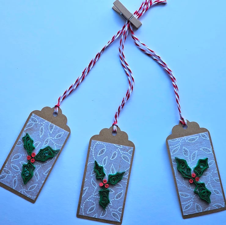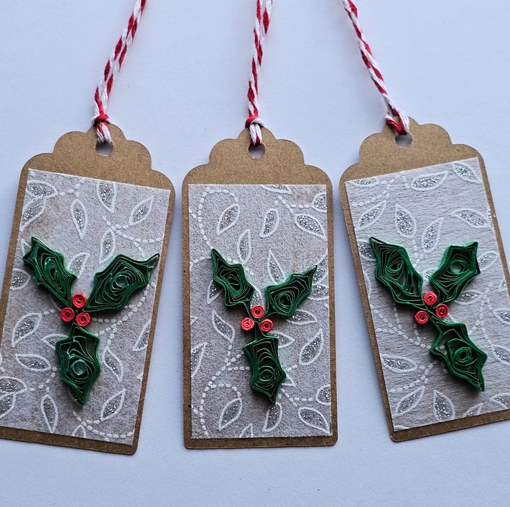 A set of quilled holly tags that will add a unique touch to your gifts at Christmas. They can also be hung as decorations and Cherished as keepsakes.