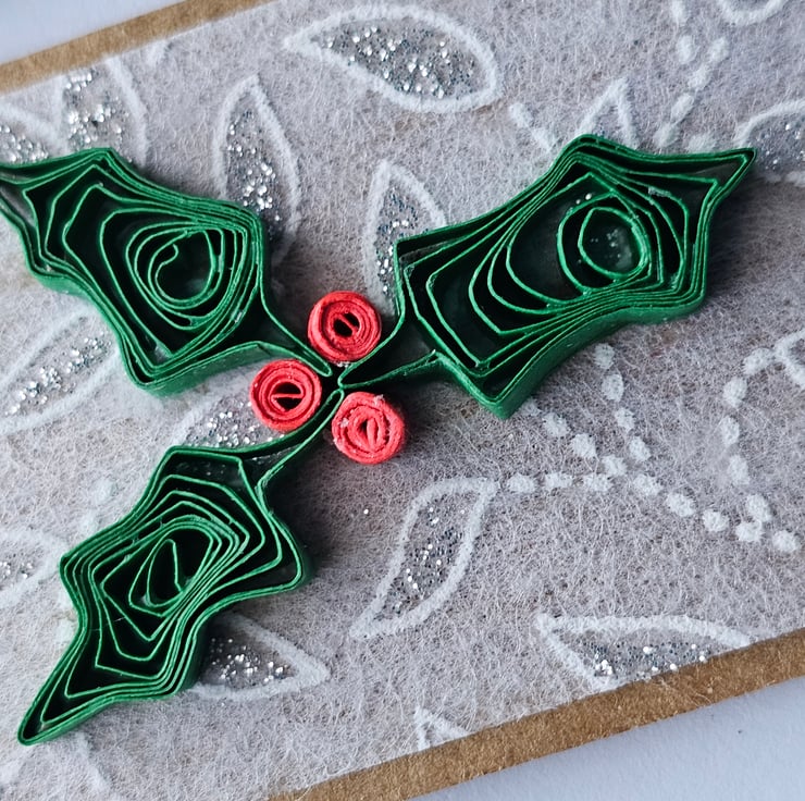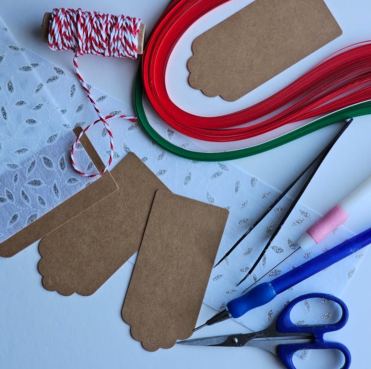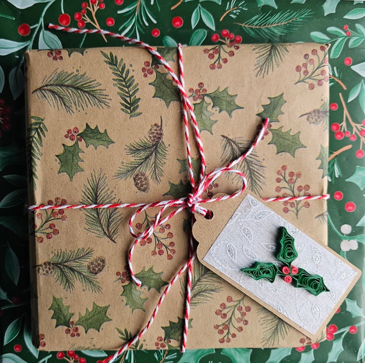 They are made using quality materials, thick brown kraft card, special paper with silver leaf pattern, red and green quilling paper strips and red and white twine. There will be small variations between the tags (shapes, positioning, shade of green, etc.) as they are individually handmade which makes them unique.