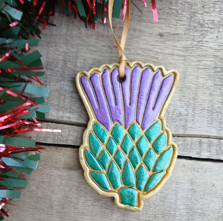 Add a wee touch of Scotland to your Christmas tree with our handcrafted, hand-painted Scottish thistle, complete with gold hanging ribbon.