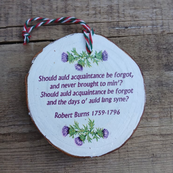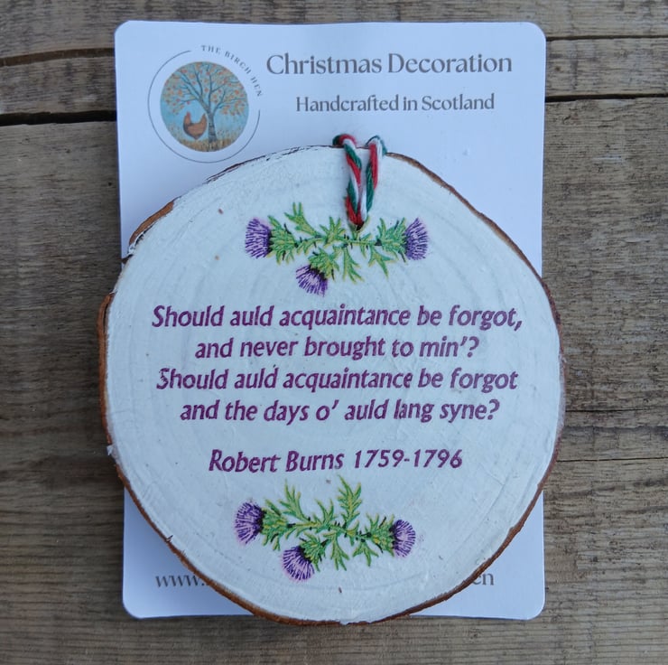 Add a Scottish touch to your Christmas tree with a wooden slice ornament. Hand-painted, decoupaged, sealed, and completed with a festive holiday hanging loop, it's the perfect decoration.