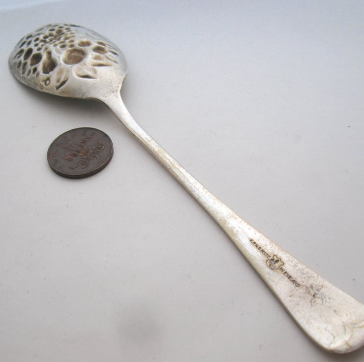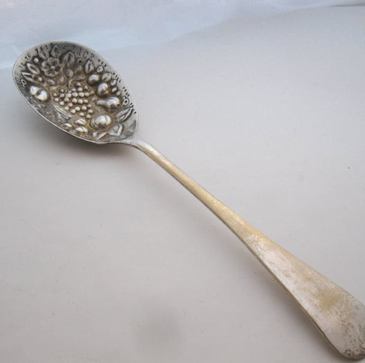 The spoon is silver-plated; some of the original plating is somewhat worn, especially on the handle. It measures approx. 22cm long - a nice size for serving dessert. It would make a fun little gift for a housewarming, wedding or anniversary or make a nice addition to your festive dinner table.