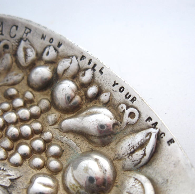 A vintage fruit pattern embossed 'berry' spoon that I've handstamped around the edge in block letters: