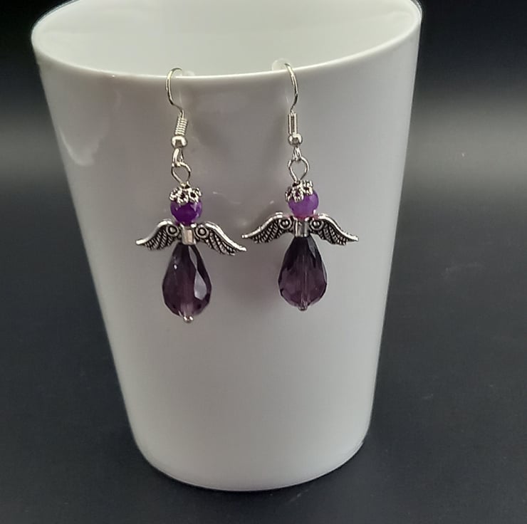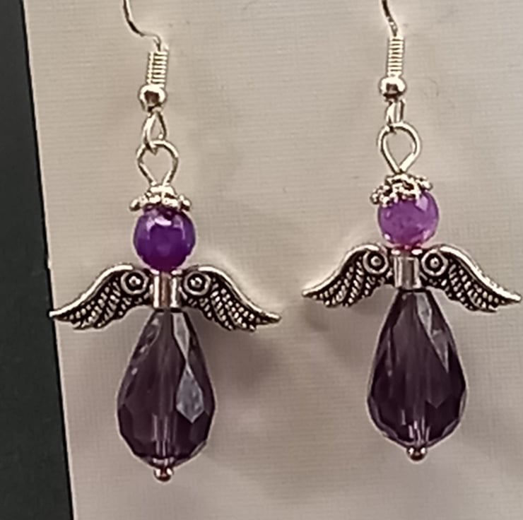 These angel earrings have fire agate heads, deep purple crystal bodies, metal wings and tiny bead caps. The beads are threaded onto silver plated head pins and have silver plated ear hooks with rubber backs. They measure 3.4cm in length by 2.2cm at widest point.