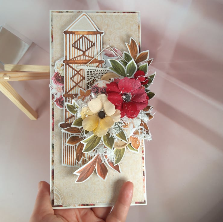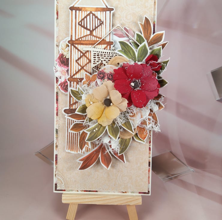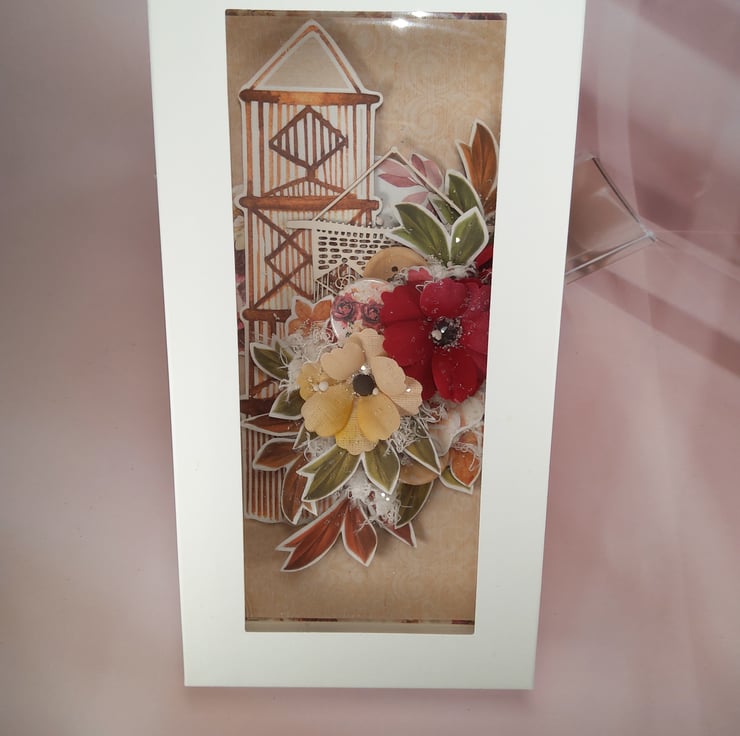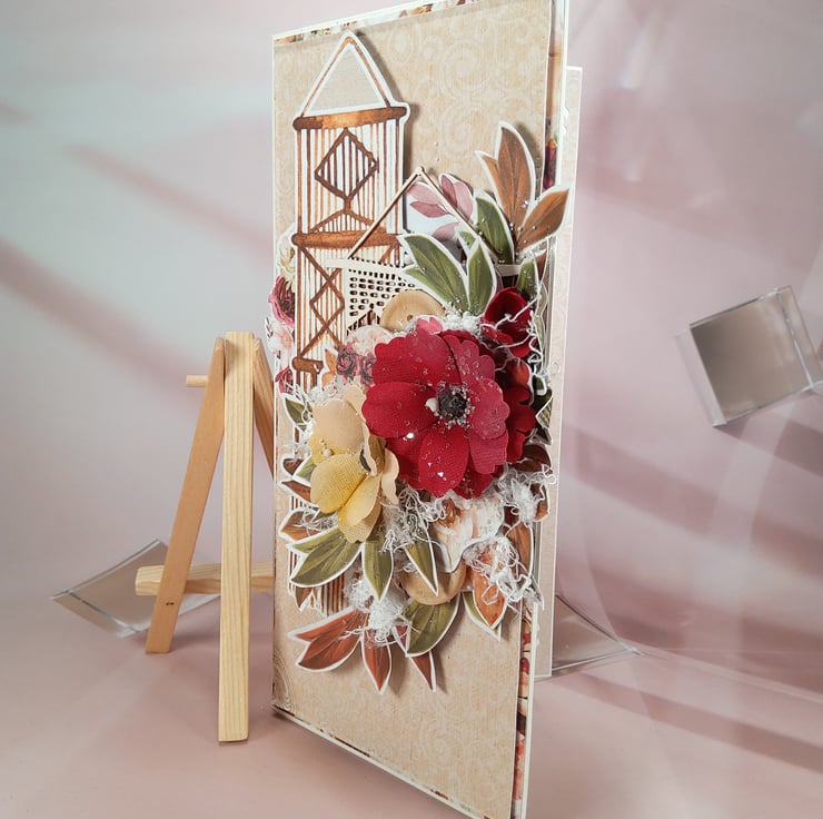 A beautifully handcrafted slimline card created in warm, earthy tones and decorated with layered handmade flowers. The composition features rich foliage, textured elements and delicate crystal glass pieces that add a subtle, elegant sparkle.