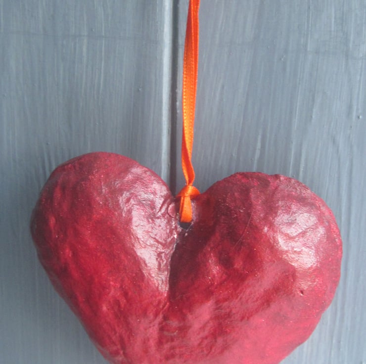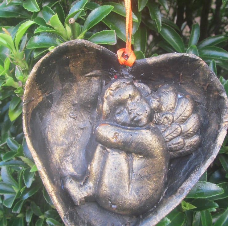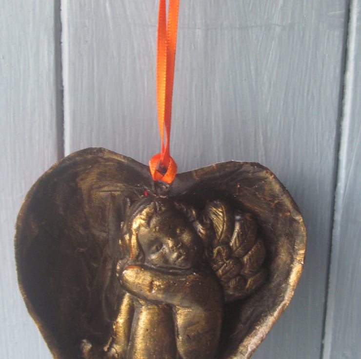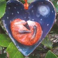 Paper mache heart shaped Christmas decoration, handmade in Cornwall from recycled materials. This sweet little Cherub is curled up asleep within a heart, it measures approx. 9 cm x 9 cm and would look lovely either on a tree or garland or on its own. Its also not just for Christmas and can grace your home all year round.