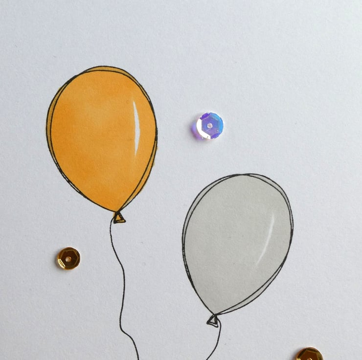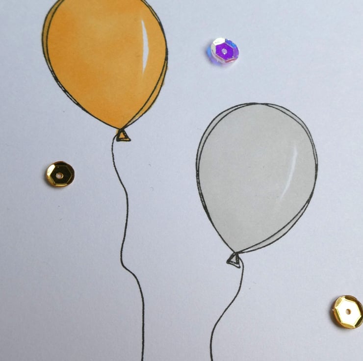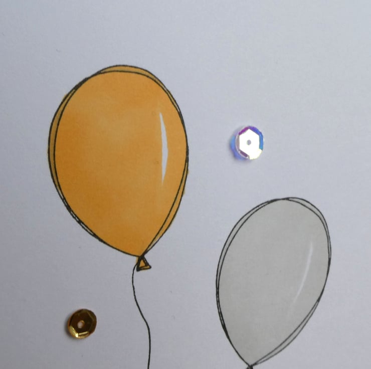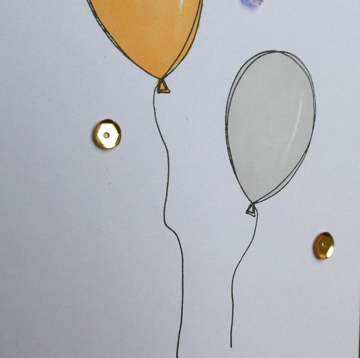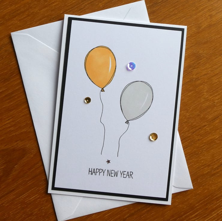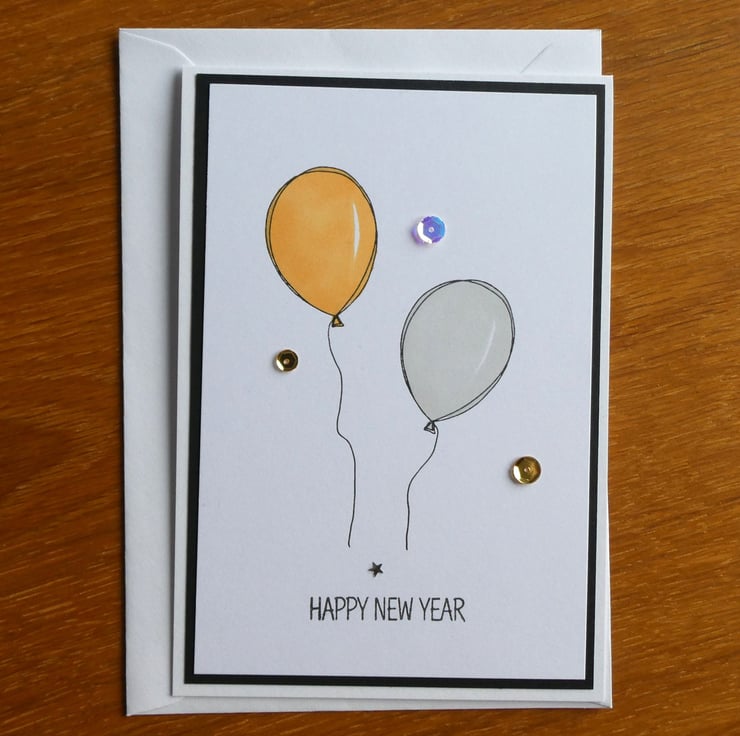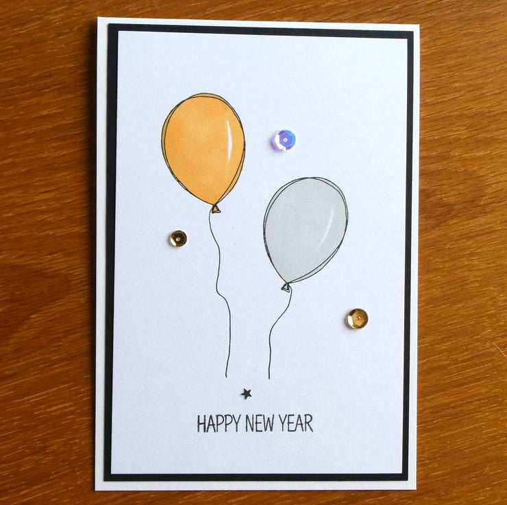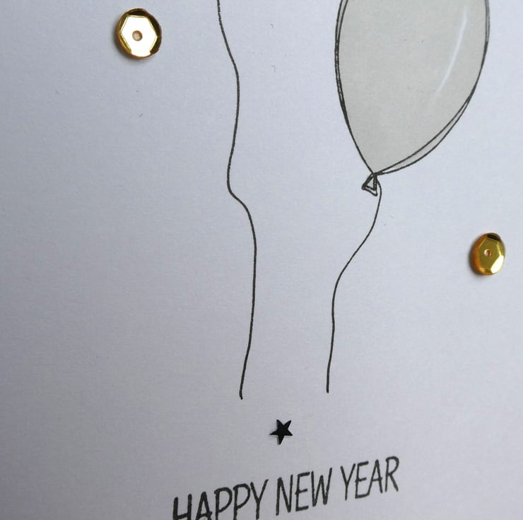This Happy New Year card has been hand stamped with balloons and finished with circular and star shaped silver sequins.