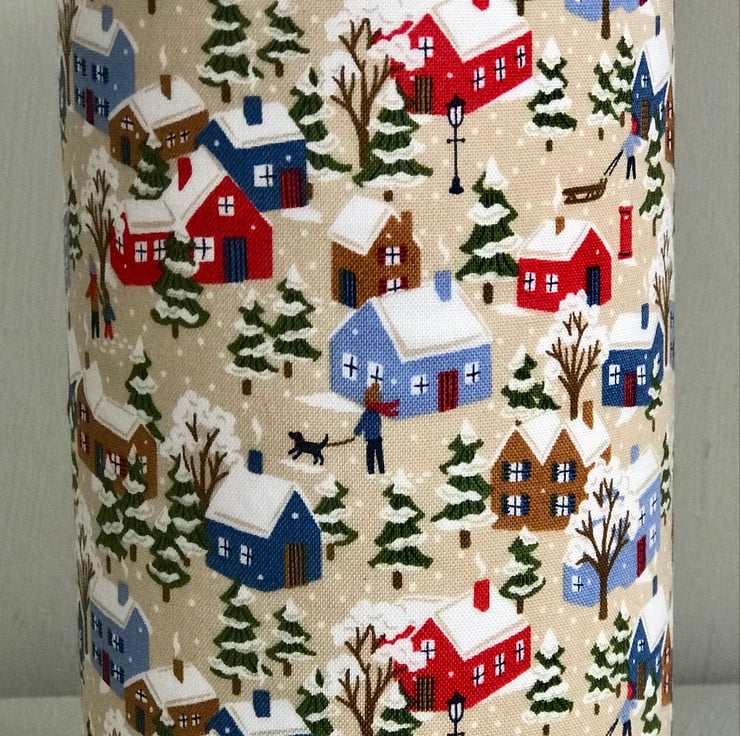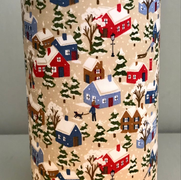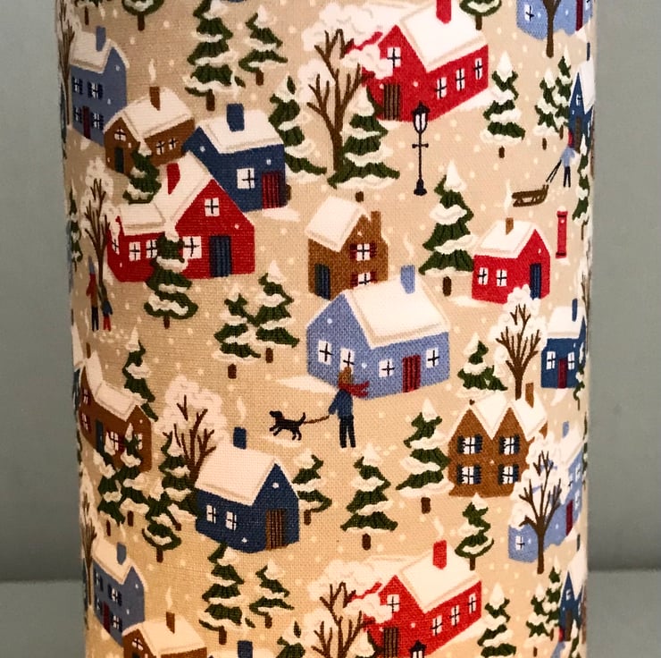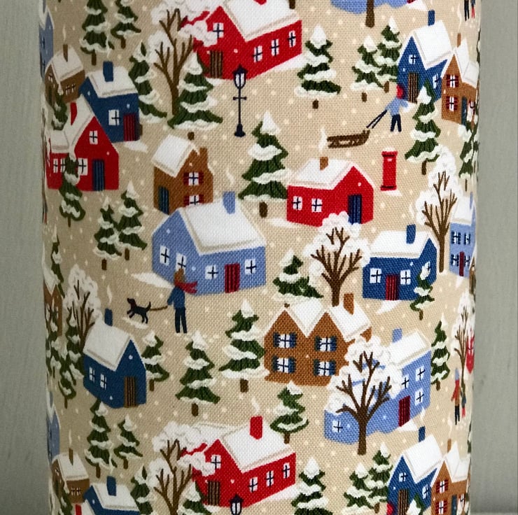 Such a delightful Hand painted Winter Wonderland village, with charming snow covered houses, hiding a multitude of quirky details within. Look beyond the snow covered trees to spot people walking their dogs, gliding sledges , vintage lamp posts and even tiny post - boxes.
