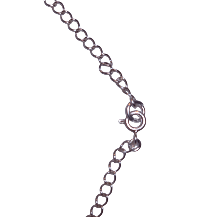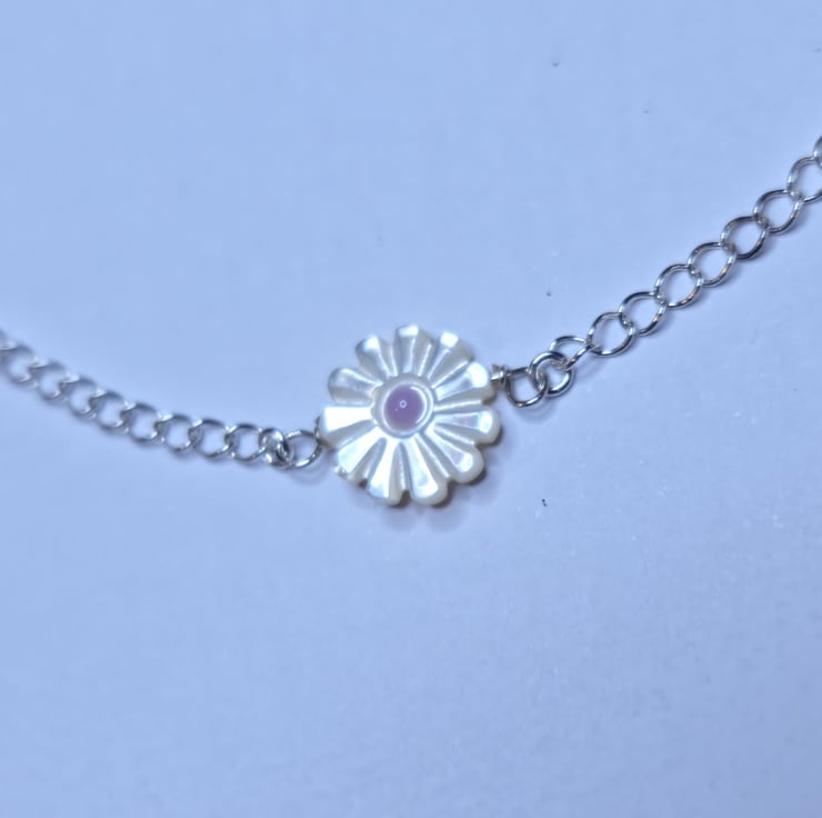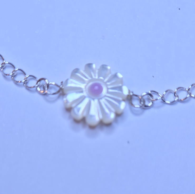 A very attractive choker, this little daisy comes from the eastern shores of the USA. Carved from white shiny mother of pearl, its centre is pink and has white daisy petals around. This little flower is secured on a dainty sterling silver curb chain which closes by a clasp at the back. This chain measures 15 38cm, if you would like another length please message me. (Please allow up to 2 days extra to receive your item) An excellent gift for a younger girl