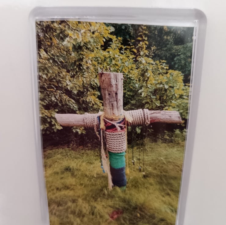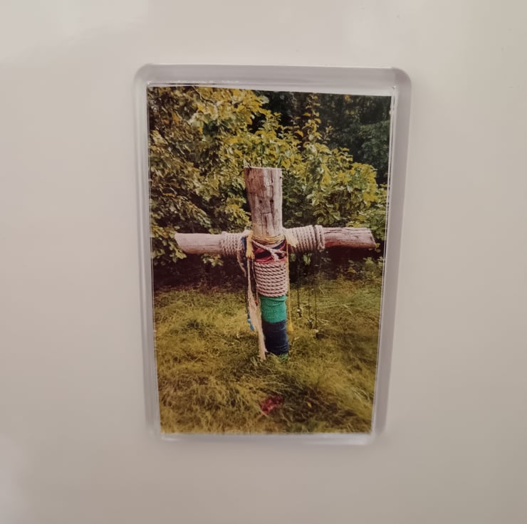 A unique and adorable image of a smiling wooden cross figure/sculpture adorns this fridge magnet. A lovely folky style design that is bound to make anyone smile.