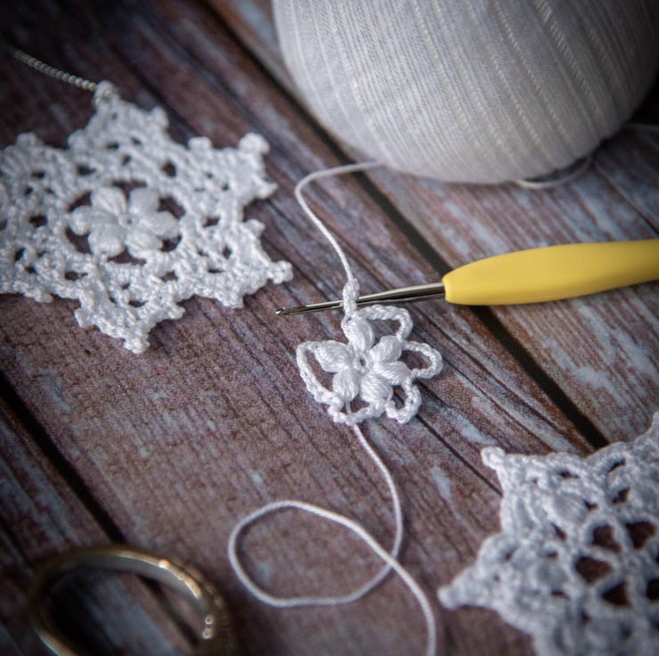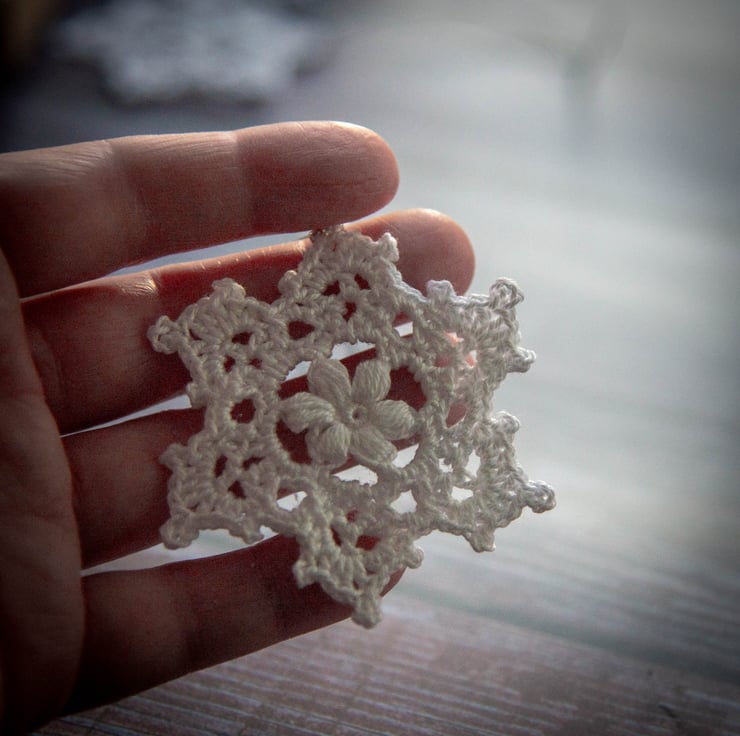 This set of snowflakes is designed and handmade by me using lace-weight cotton yarn and a 1.5mm hook. Each piece is treated with fabric stiffener to hold its crisp form beautifully over time.