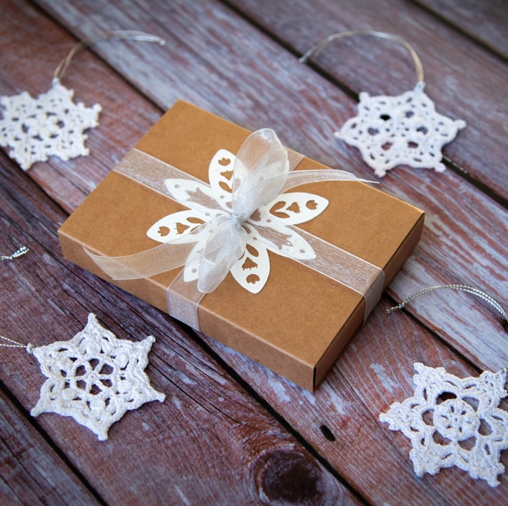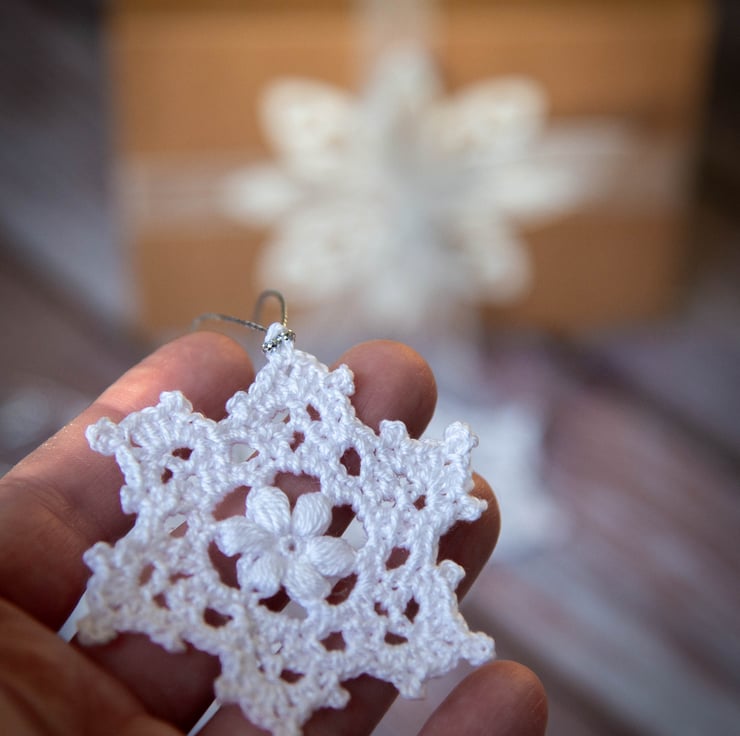 Each snowflake measures approximately 6cm in diameter and is made of 100% cotton yarn. The set is presented in a box (13.7 x 10 x 2.3cm) decorated with a white paper snowflake on the sleeve and finished with an organza ribbon.