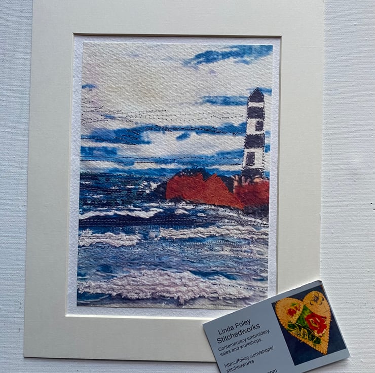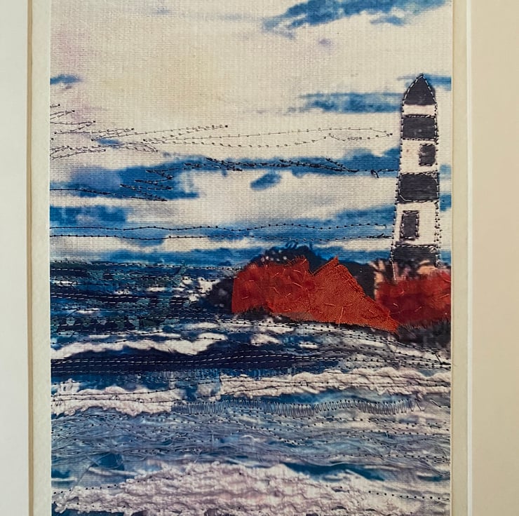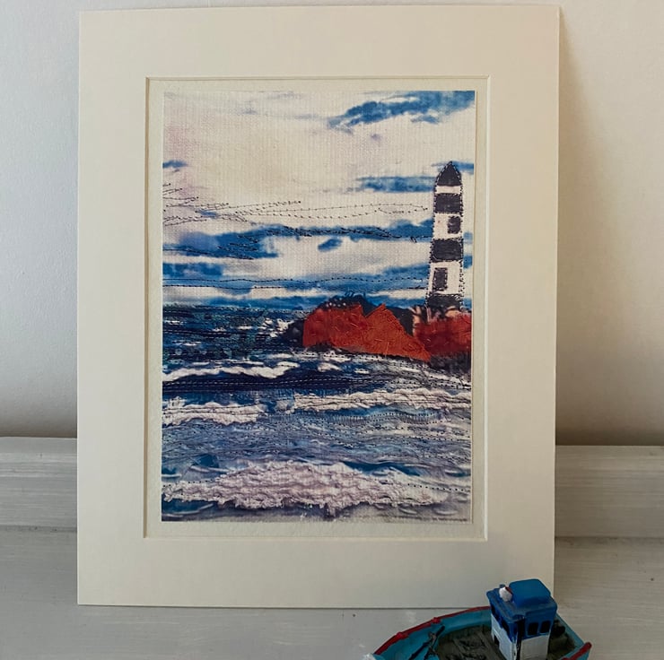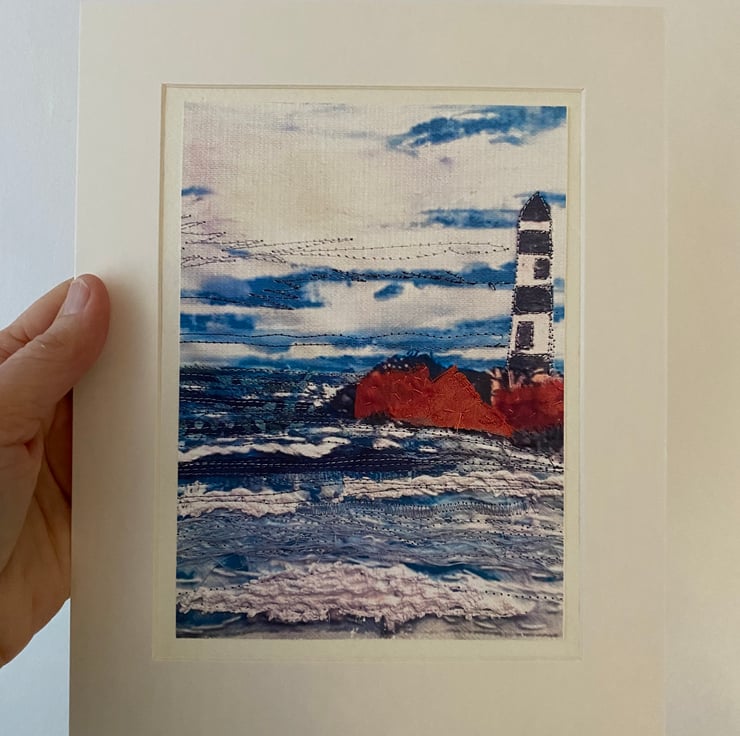 The original textile art was created from fabric collage, with hand and machine stitching.