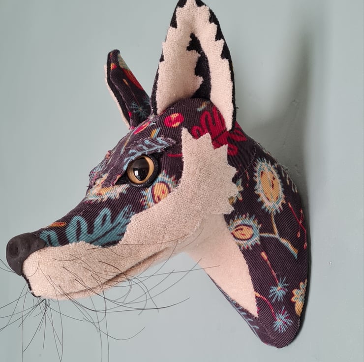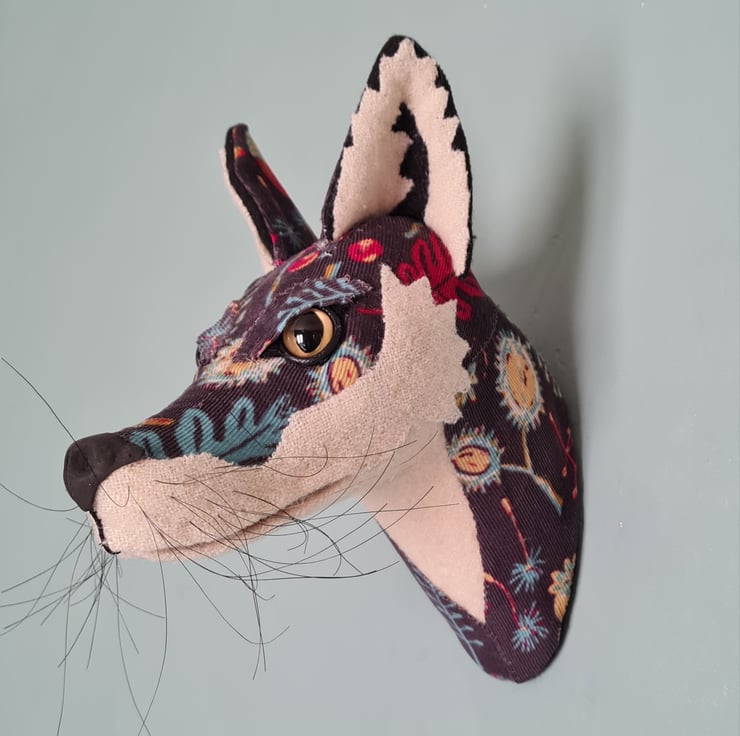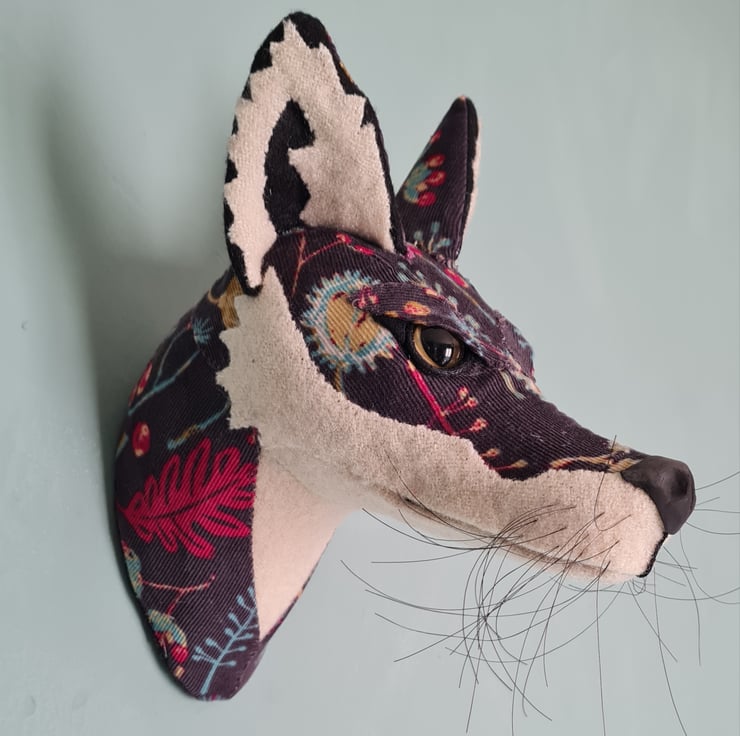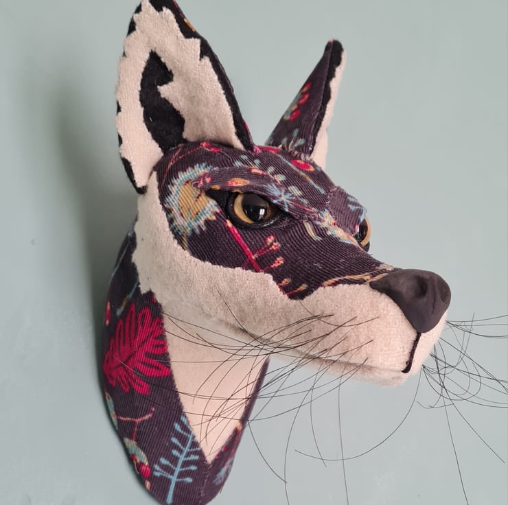Meet Frankie: A lifesize faux fox head which I have handmade and covered in hand stitched dark grey courdroy fabric, with autumnal leaves, seeds and acorns. The nose is handmade from polymer clay. The head is backed with felt and has a metal hanger to hang it on the wall. It is lightweight.