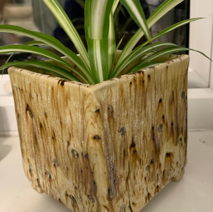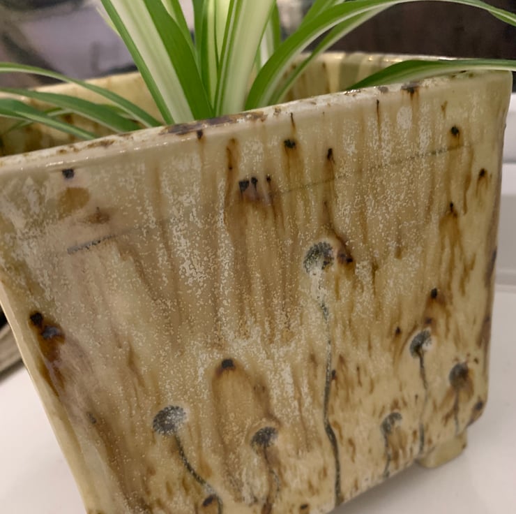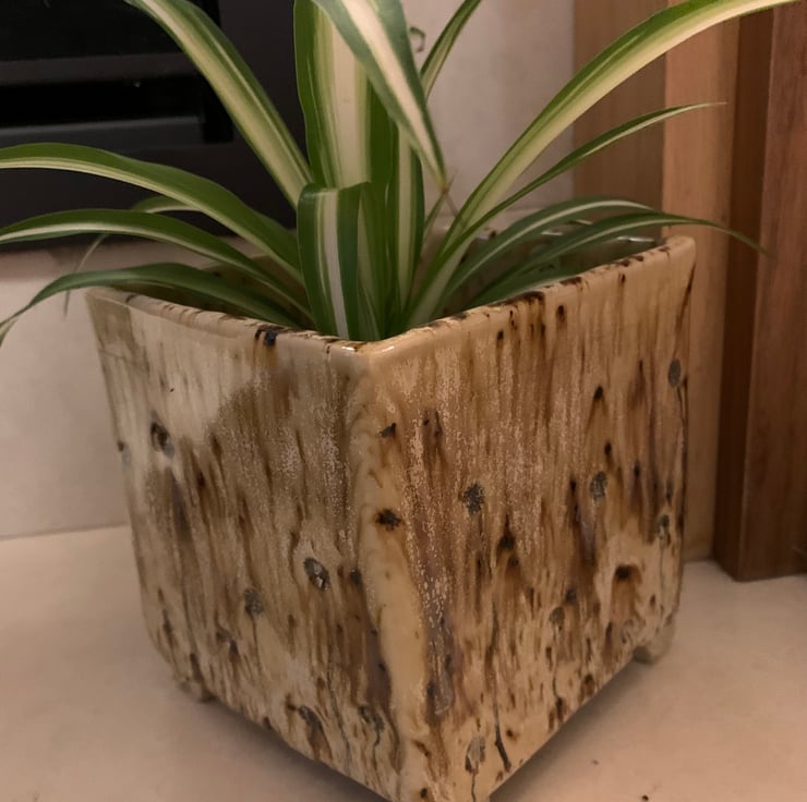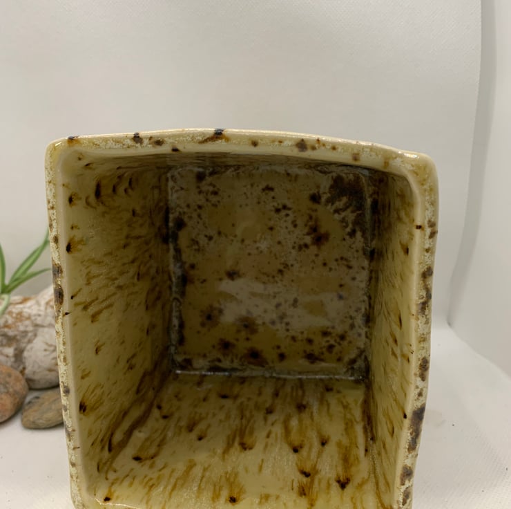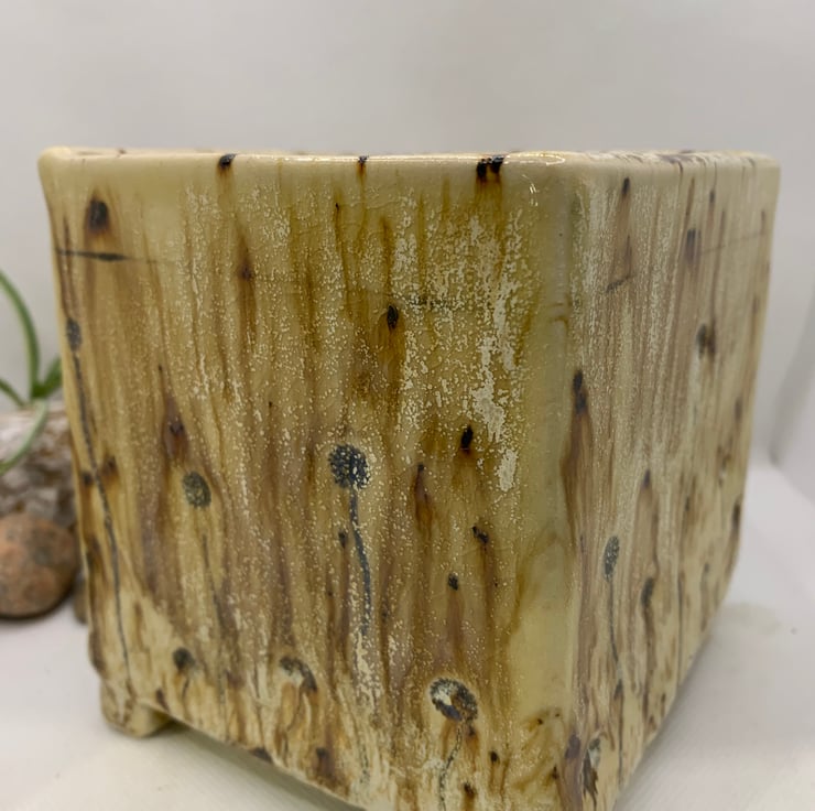 A lovely square planter that looks good standing on a floor or on a shelf. It has feet which raises it slightly. The glaze does all the work on this planter to turn a simple shape into an interesting pot. Made from stoneware so useful indoors or outdoors.