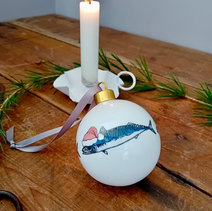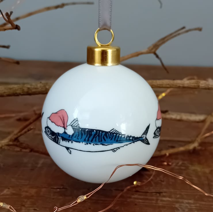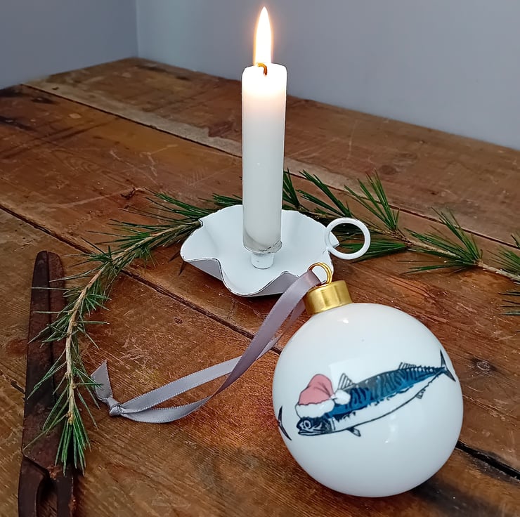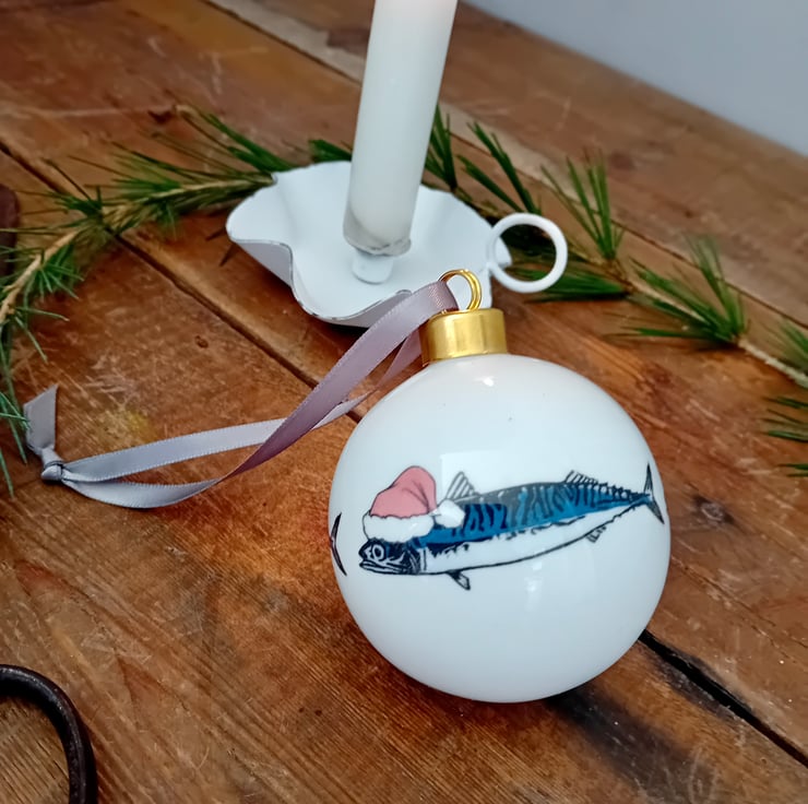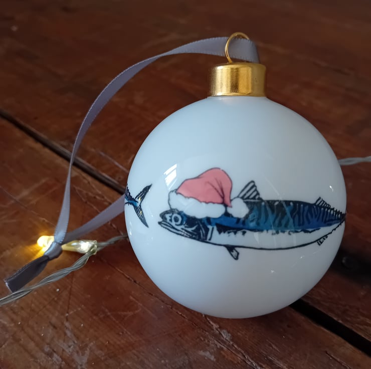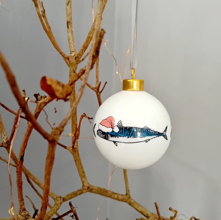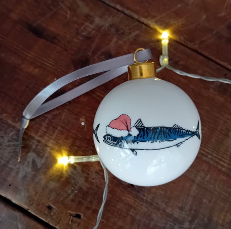 These white ceramic baubles are decorated with a mackerel in a Santa hat. The perfect keepsake ornament for those who enjoy a fun and quirky coastal Christmas. Perfect as a festive gift or decoration for your own Christmas tree.
