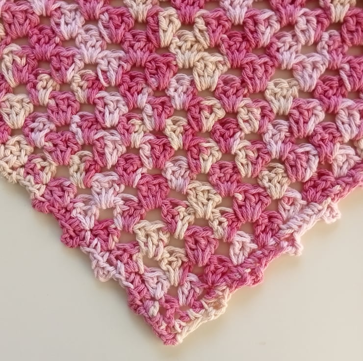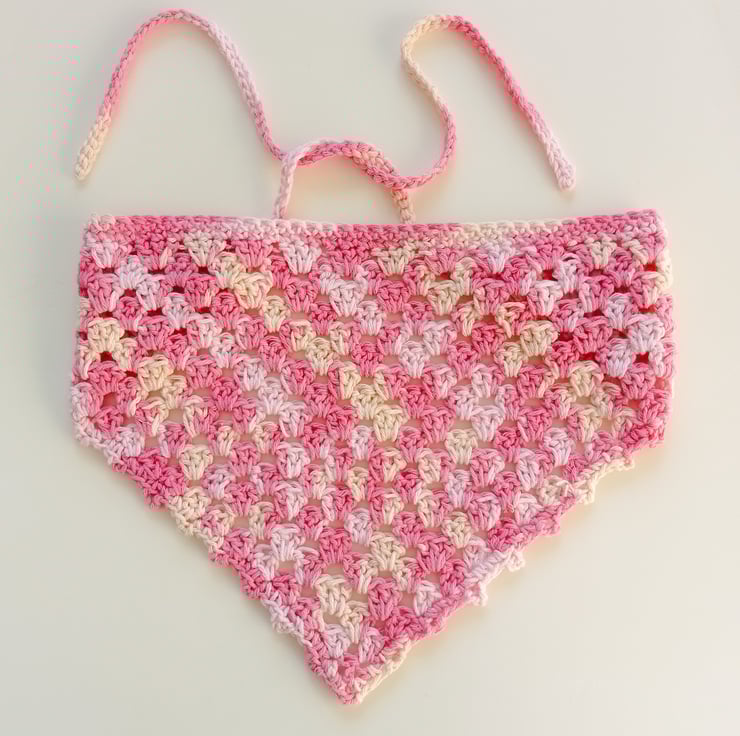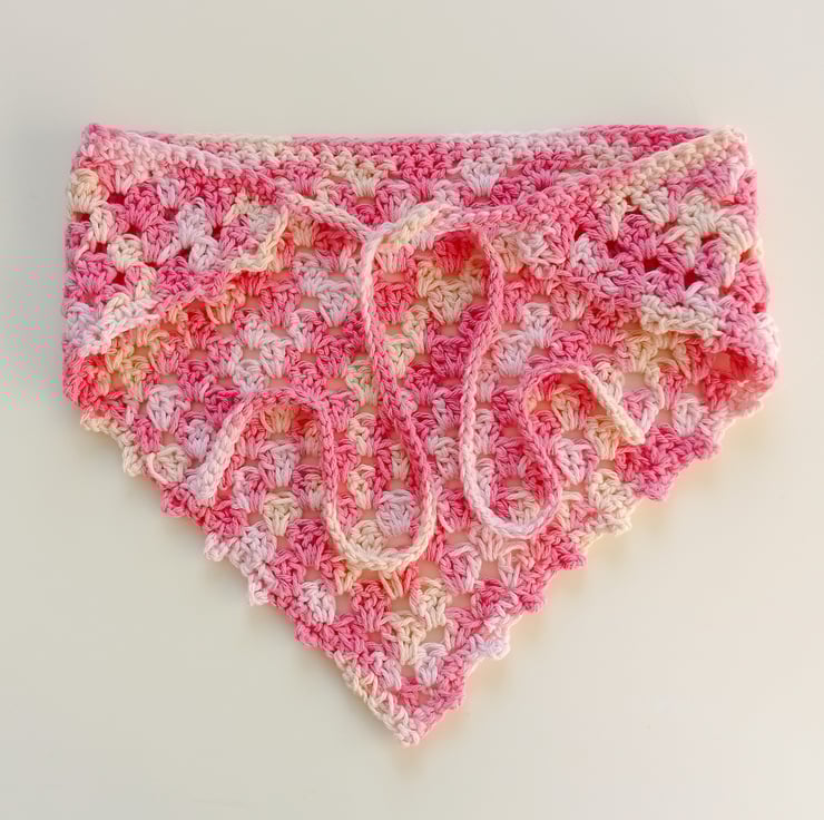 Yarn and colour: The bandana is made with Divante Cotton yarn in shade Strawberry Ombre. The yarn is 100% cotton.