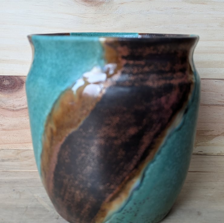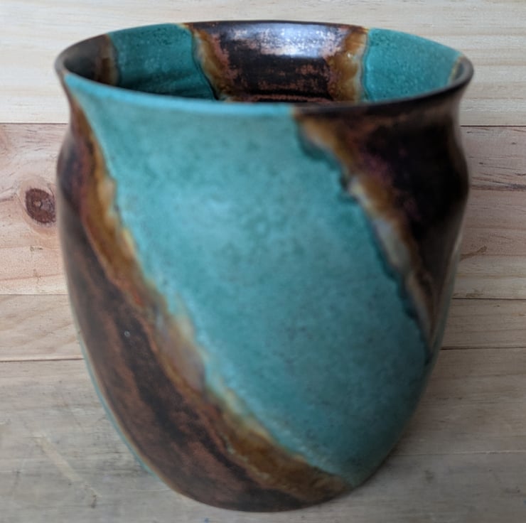 I don't often make vases but had a go at making a few. Shiny copper accents with this lovely bright green glaze. Lovely smooth glaze, fired to c1200 degrees (stoneware temperature).