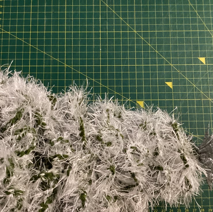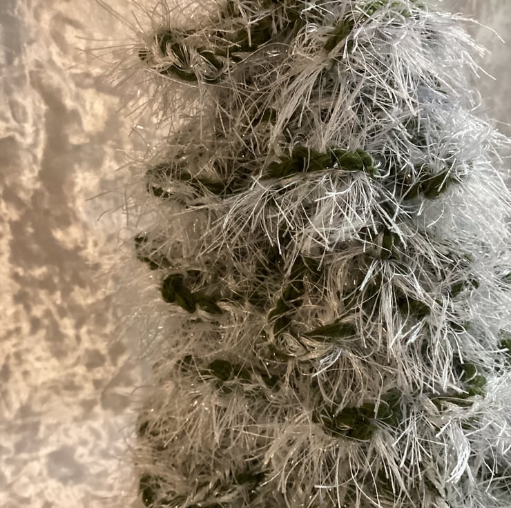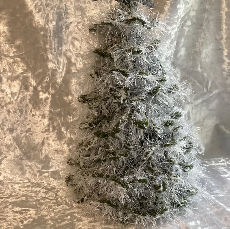 I’ve used green yarn and eyelash yarn, create snow effect . Inside the tree I’ve used Fibre Stuffing and felt to finished it.