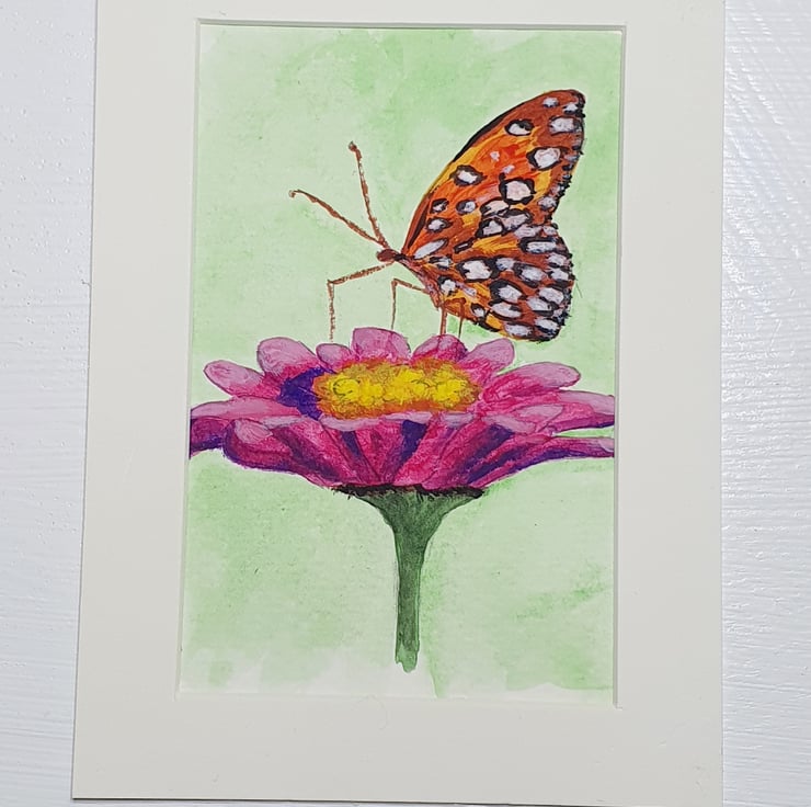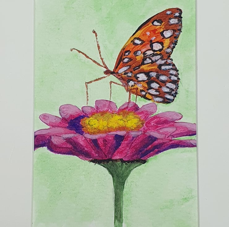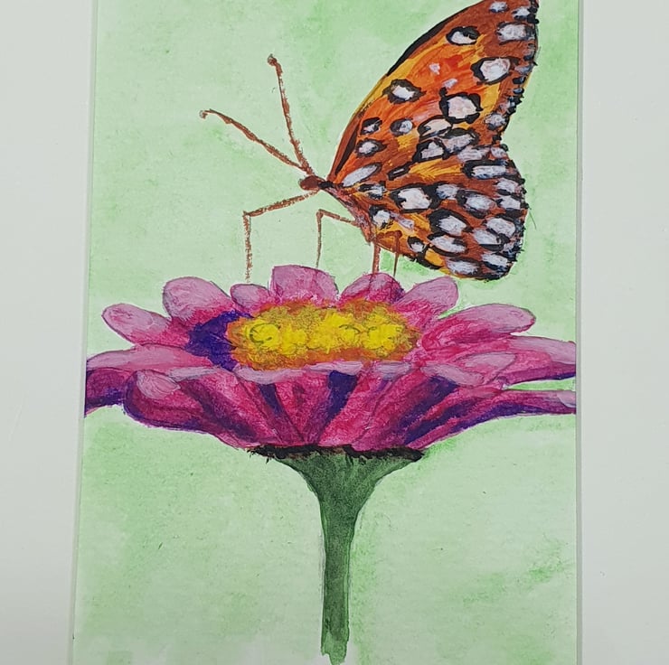 Hand sketched drawing of a Butterfly on a flower. Hand painted in Acrylic paint. Original artwork. Copied from a photo