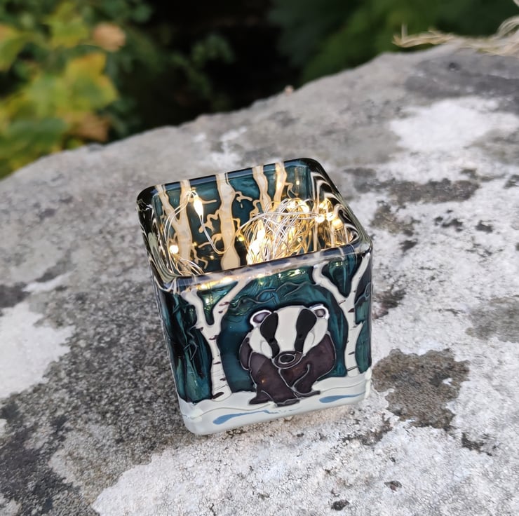 Hand painted glass candle holder, 5cm x 5cm, depicting a badger in the snow, in a birch wood under a moonlit winter night