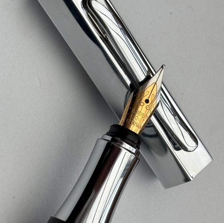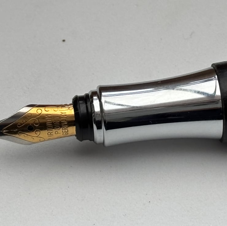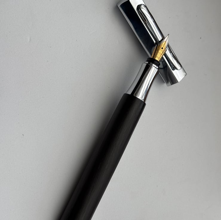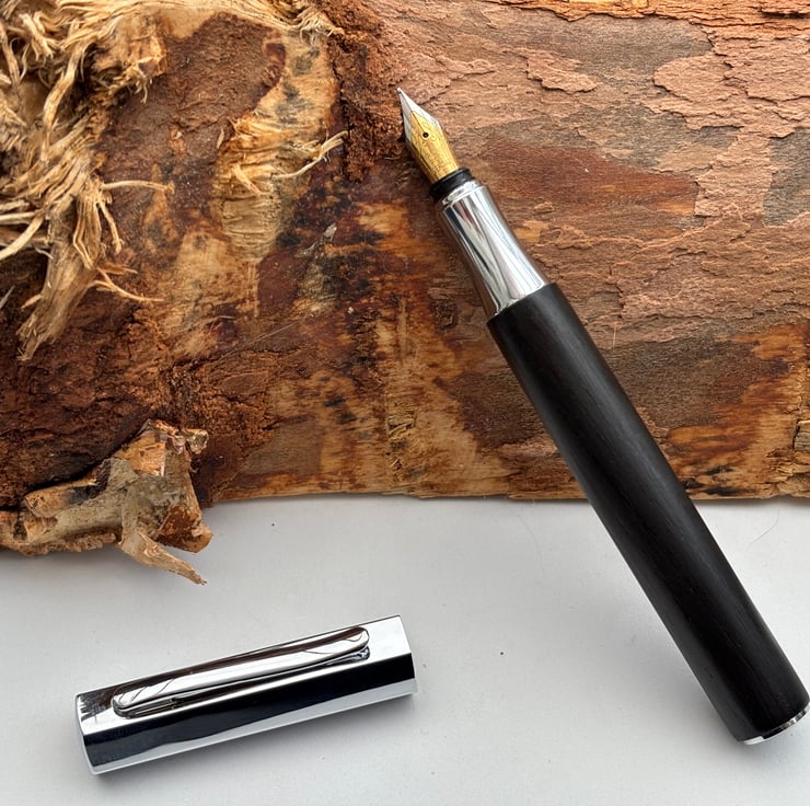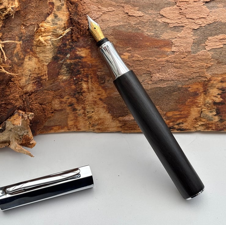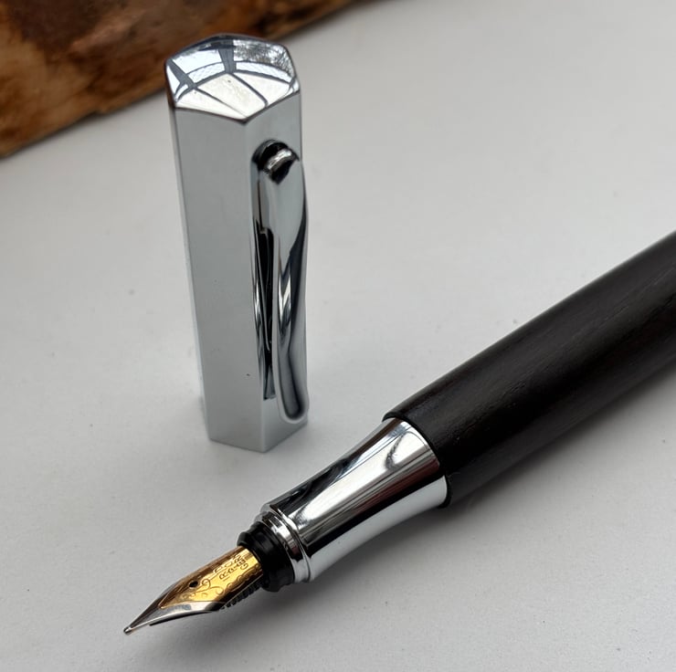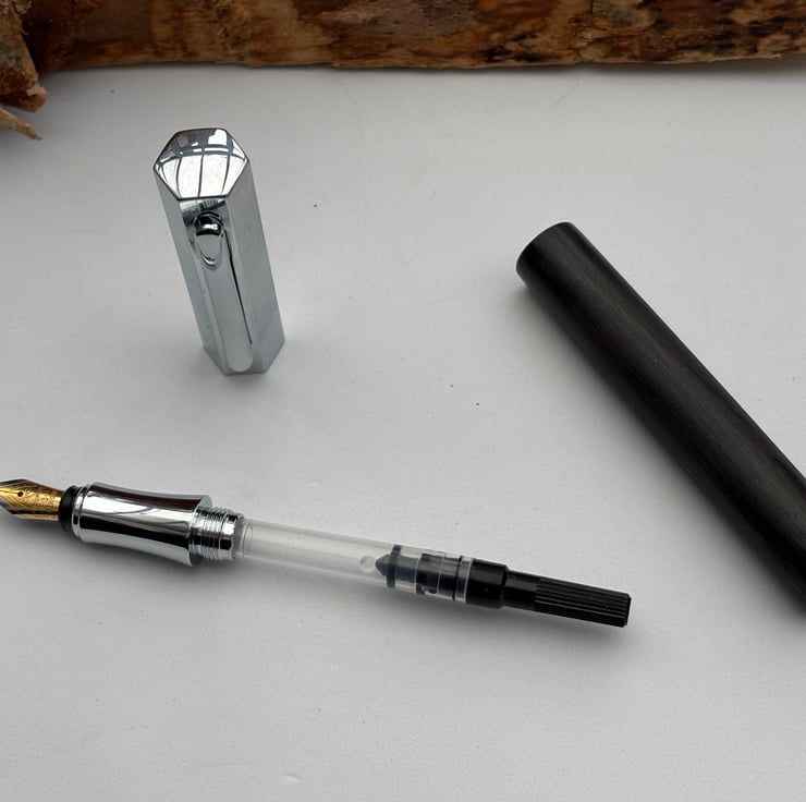 Handmade by the shop owner in his home workshop. Elevate your writing experience with a unique blend of modern design and timeless tradition. This handcrafted hexagonal fountain pen is a true statement piece, perfect for anyone who appreciates quality and history. The fittings choose are in chrome so as to contrast starkly with the black coloured wooden body. I have two of these currently available and they are identical due to the nature of the wood (one pictured). Black ink refill installed.