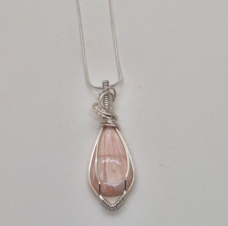 I've hand wrapped Scolecite using silver plated square wire, the design is a favourite of mine, to hold and show the natural beauty of the stone.