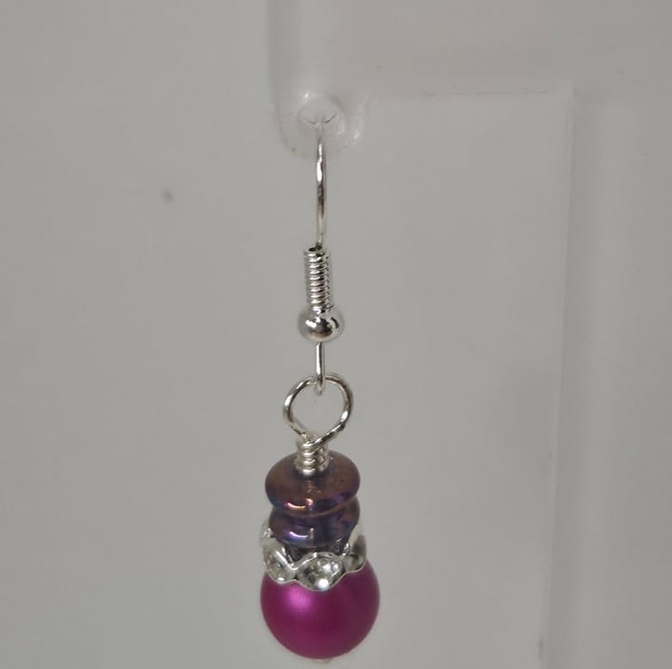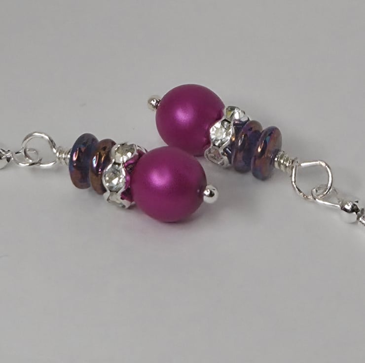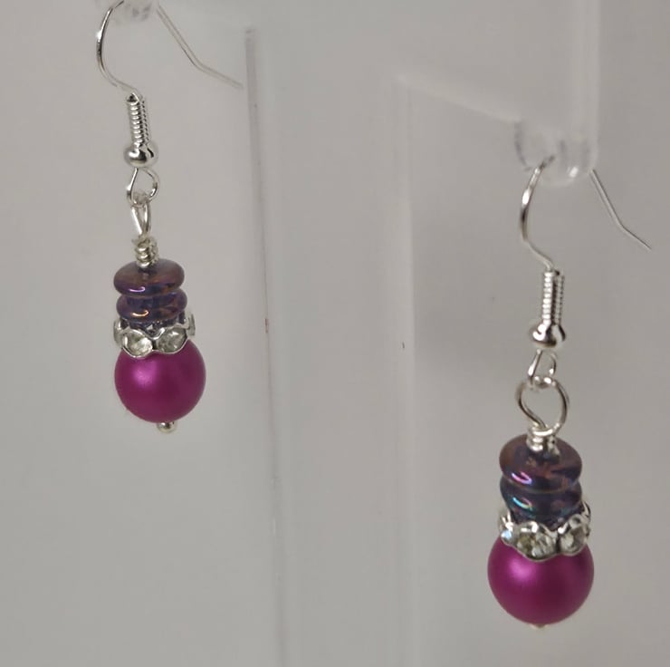 These vibrant plum-drop earrings radiate colour and character, combining a rich matte Czech glass bead with shimmering iridescent discs that catch the light like tiny twilight sparks.