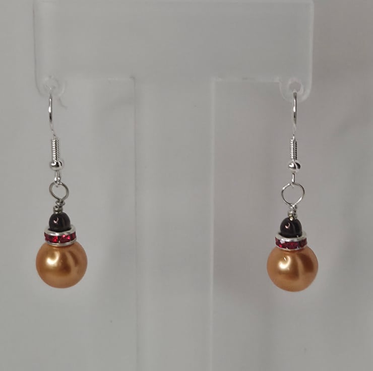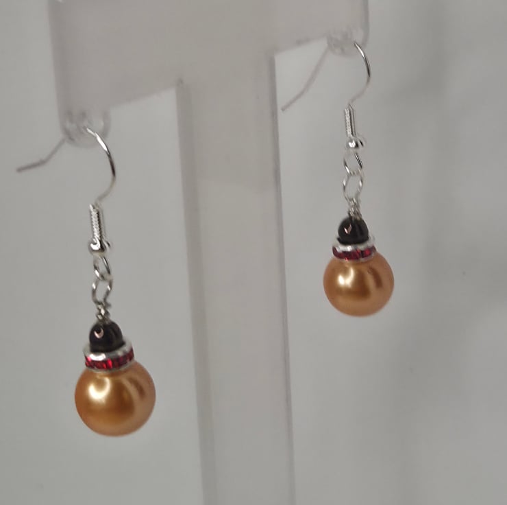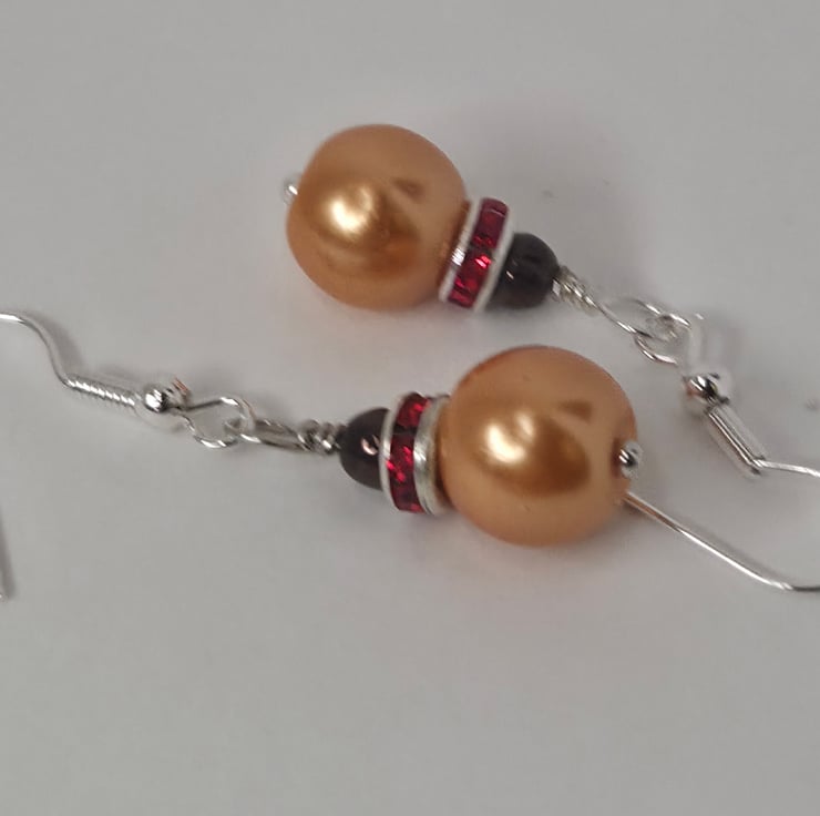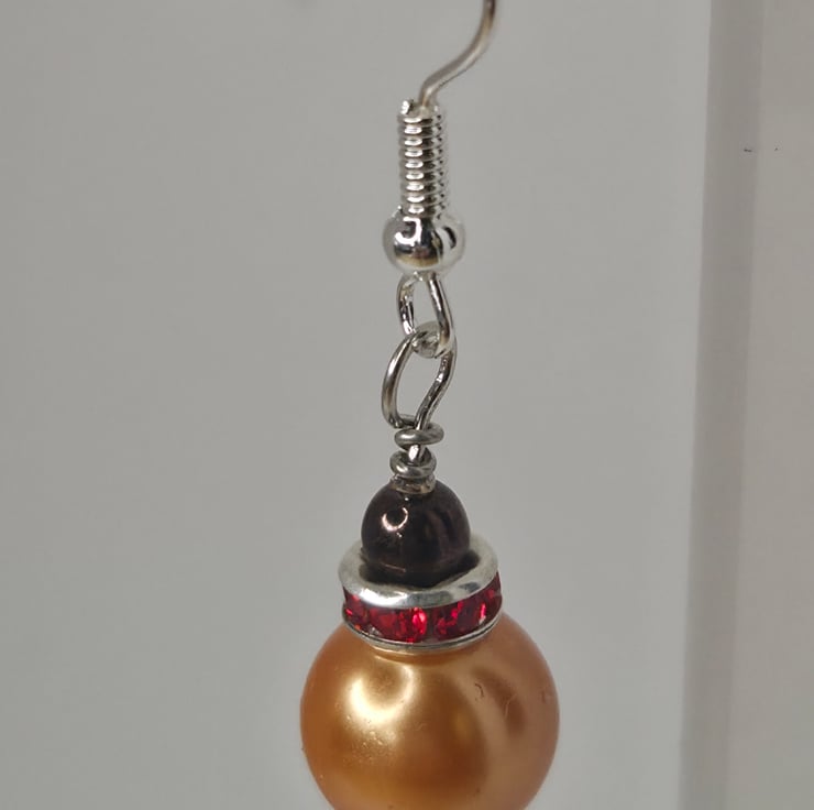 These elegant drop earrings feature a rich golden glass pearl topped with a deep chocolate bead, finished with a slim red crystal spacer for a hint of sparkle.