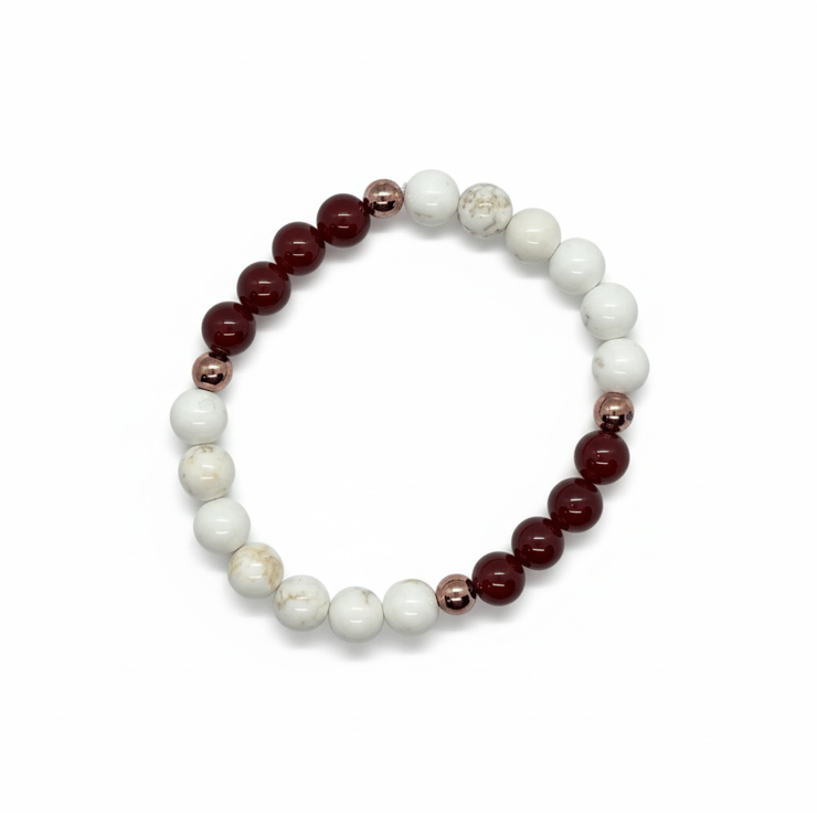 Elevate your style and spirit with our stunning handmade bracelet featuring 8mm Red Carnelian and Cream Magnesite beads, beautifully accented with 6mm rose gold hematite. This unique piece not only adds a pop of color to your outfit but also harnesses the soothing energy of Magnesite, known for its ability to reduce anxiety and promote emotional healing. The vibrant Carnelian beads are celebrated for their vitality-boosting properties, enhancing motivation and confidence. Wear this bracelet as a fashionable reminder to stay calm, centered, and inspired throughout your day. It has an elastic base for comfort and ease of use and will fit wrists up to 8”. Will be wrapped in tissue and placed in an organza bag ready for gifting .