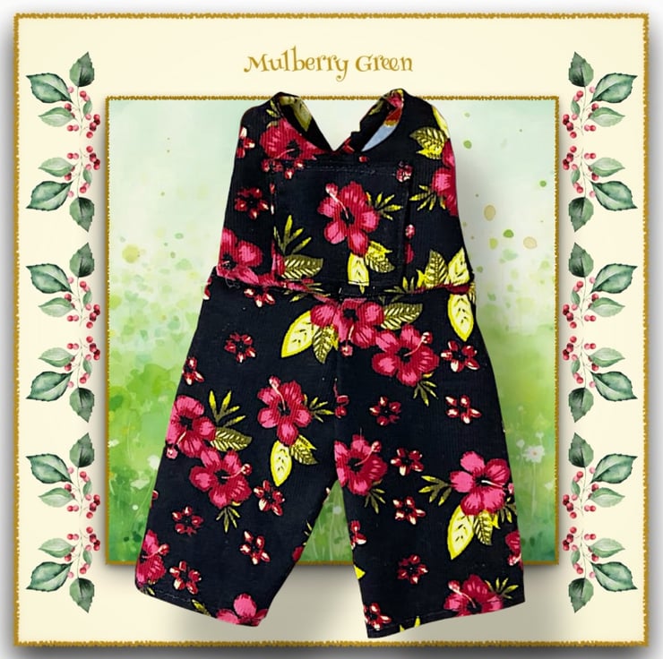 A pair of lovely dungarees with a bib pocket, in a flower print, made to fit the Mulberry Green characters. They are made from corduroy and fasten with two little poppers under buttons on the straps at the back.