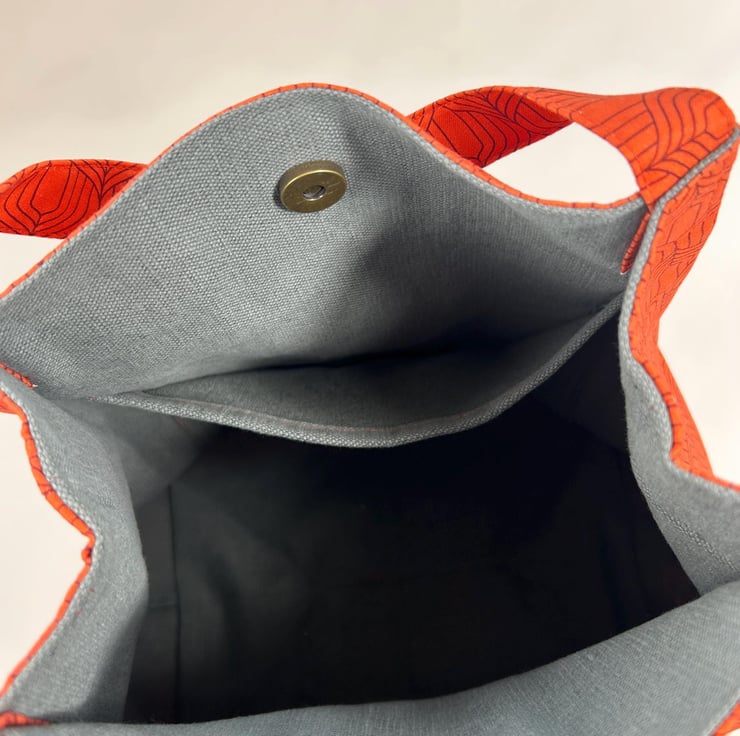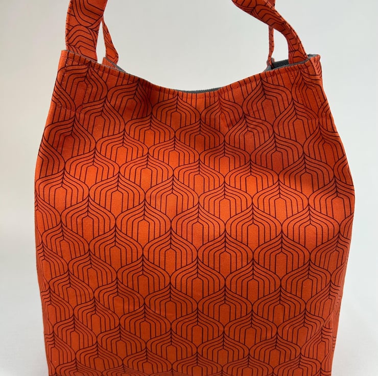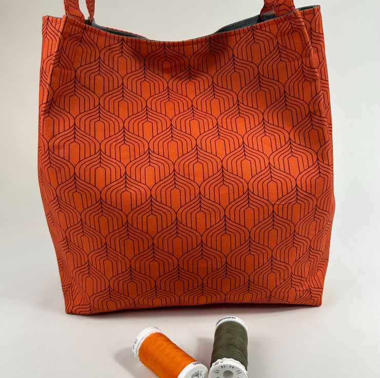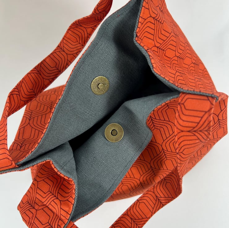Brighten your everyday carry with this beautiful geometric print tote bag crafted from prime cotton with a bold orange pattern. This hand held bag is fully lined, boxed and interfaced to give it structure. There is a pocket inside and a magnetic clasp closure for security. It is lightweight, sturdy and roomy enough for groceries, books or daily essentials. A stylish, reusable, eco-friendly alternative to plastic bags - perfect for markets, errands, school or gifting.