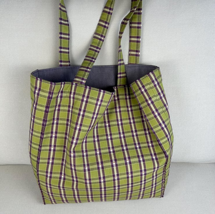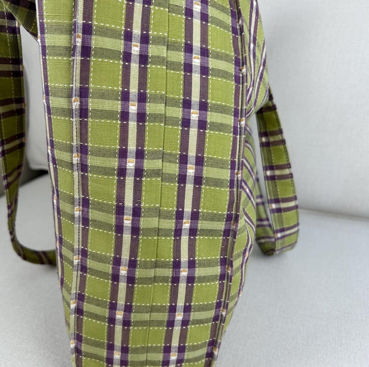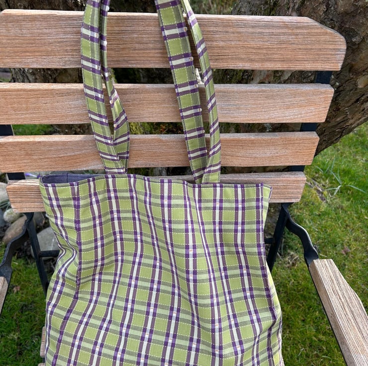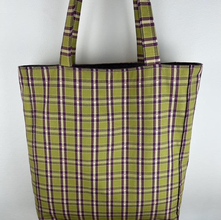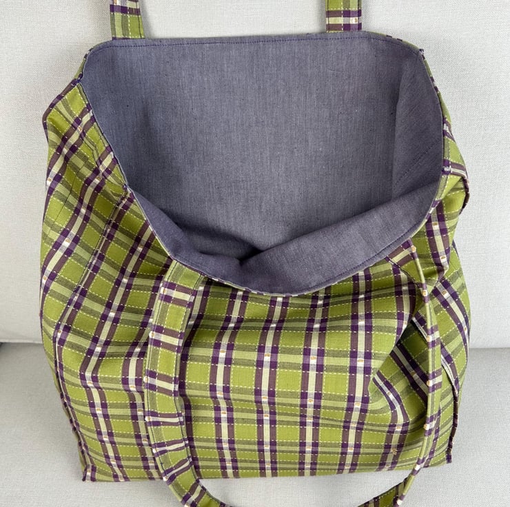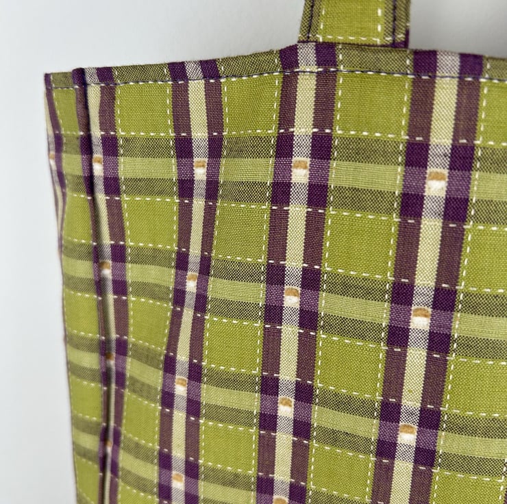 This tote bag is made with a lovely green and lavender coloured small scale woven fabric. The plaid fabric is 70% cotton and 30% rayon. The tote is fully lined in a complementary lavender coloured cotton and the corners and sides are boxed to give it shape.