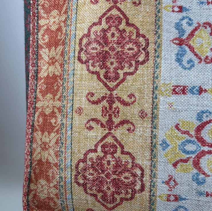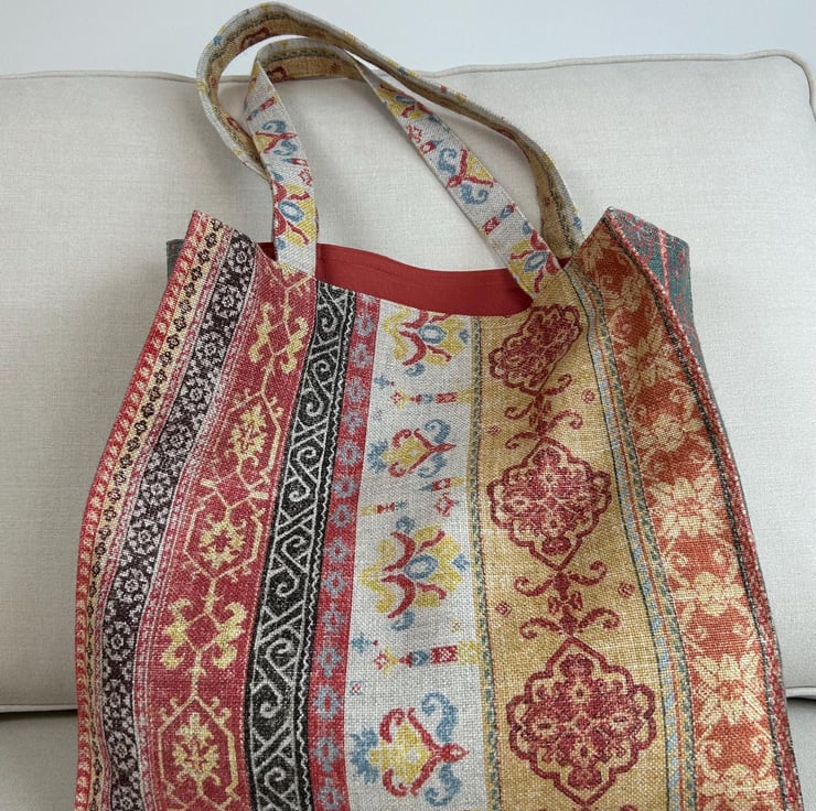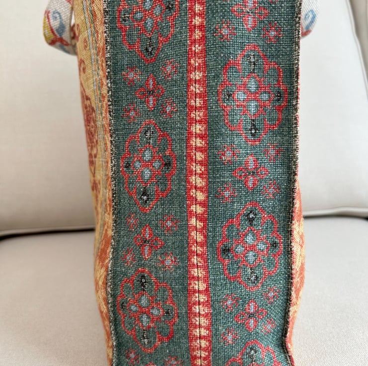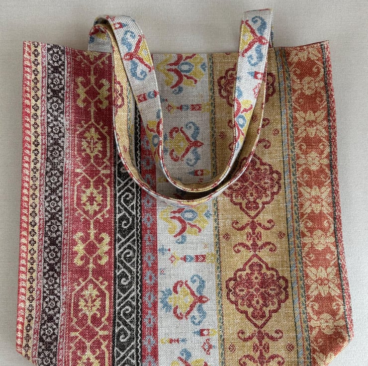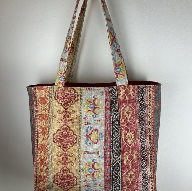 This fabric bag features a rich, intricate pattern with vertical stripes, each showcasing unique designs inspired by traditional motifs reminiscent of vintage or bohemian styles. The fabric is a mix of viscose, linen and cotton and has a textured, woven appearance, giving the bag a handcrafted feel. The colour palette includes warm tones of red, gold, beige and brown, accented by soft blues and yellows.