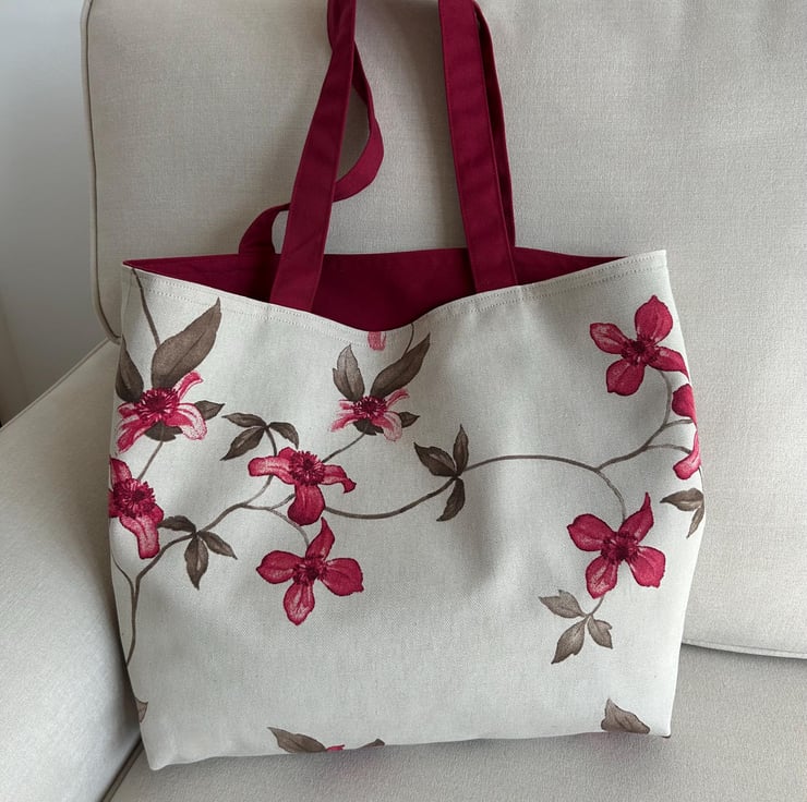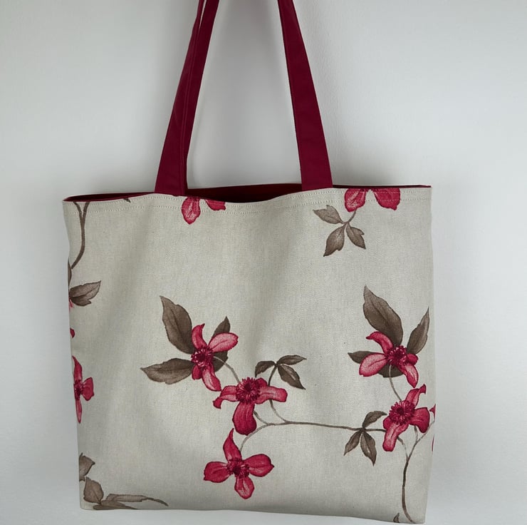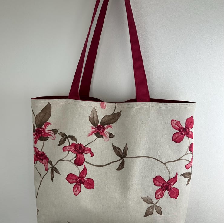 This long handled tote is in a beautiful simple floral pattern on a natural beige background. The fabric is 80% cotton and 20 % polyester. The bag is fully lined in dark red cotton.