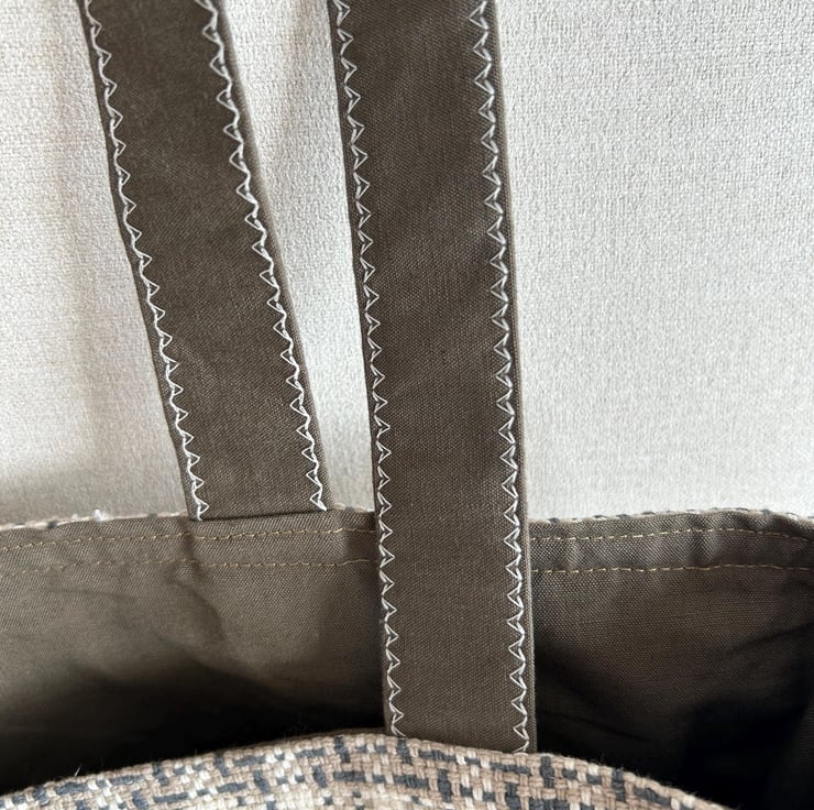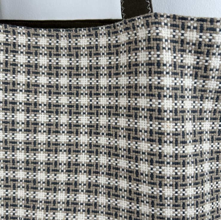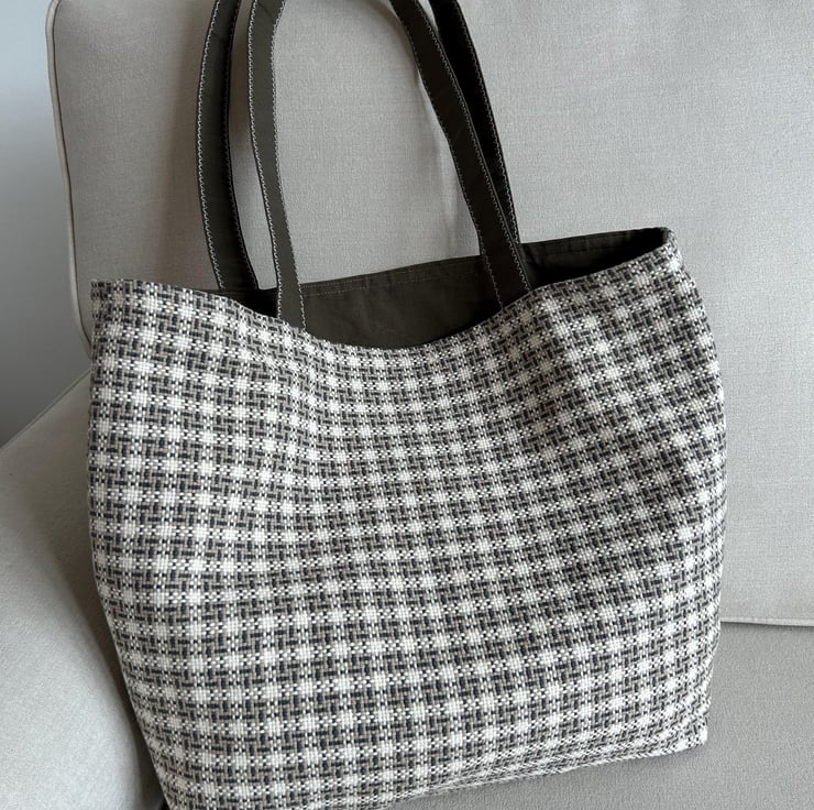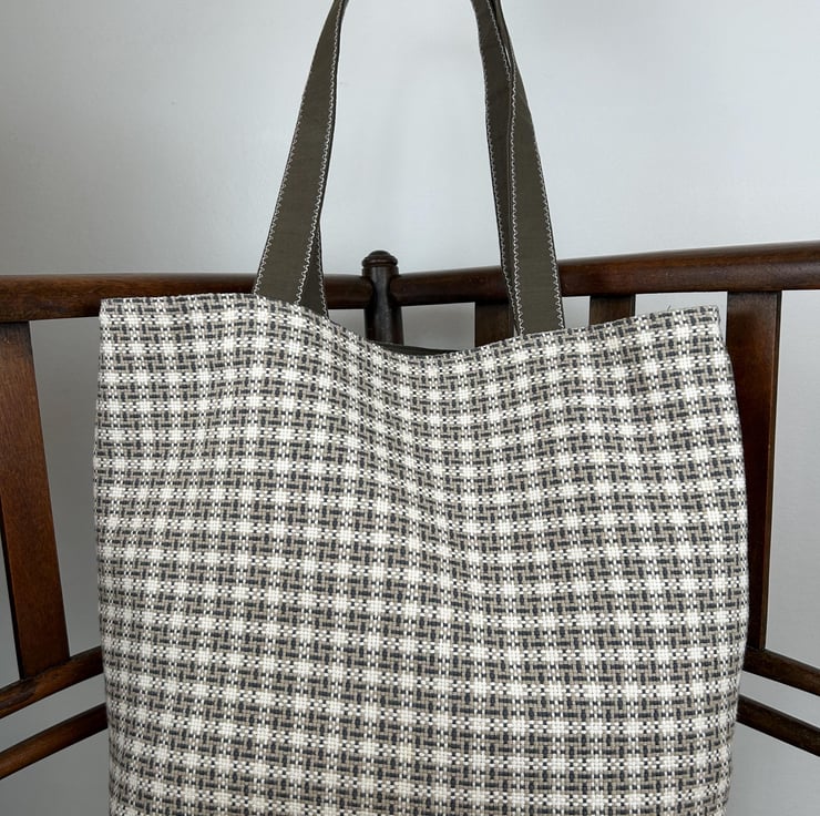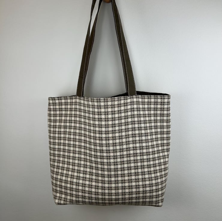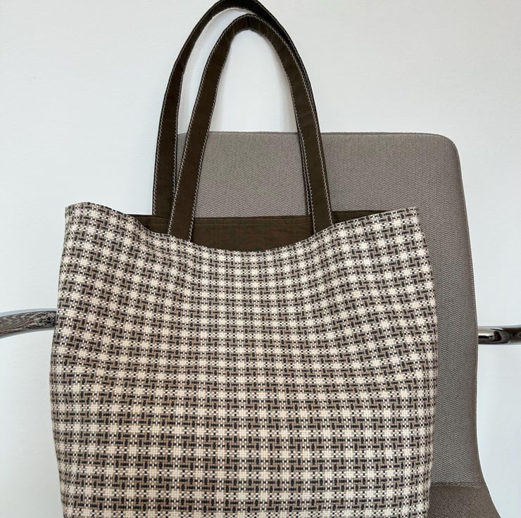 Lovely neutral coloured tote bag in a brown and cream woven check with dark brown cotton handles and lining.