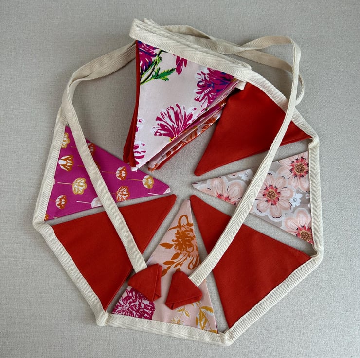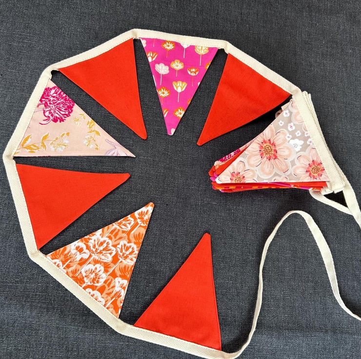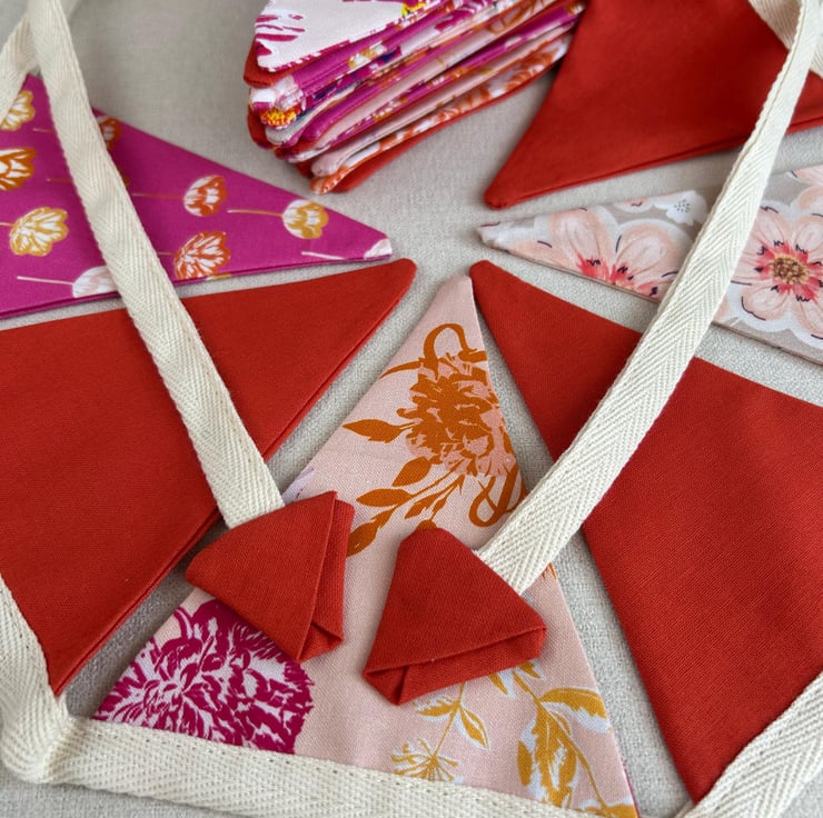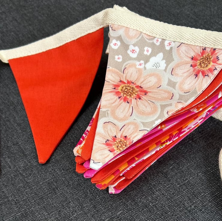 Celebrate in style with this handmade orange and pink floral bunting banner! Featuring bold orange accents paired with charming floral patterns, this cotton triangle garland brings warmth, colour and a festive spirit to any occasion.