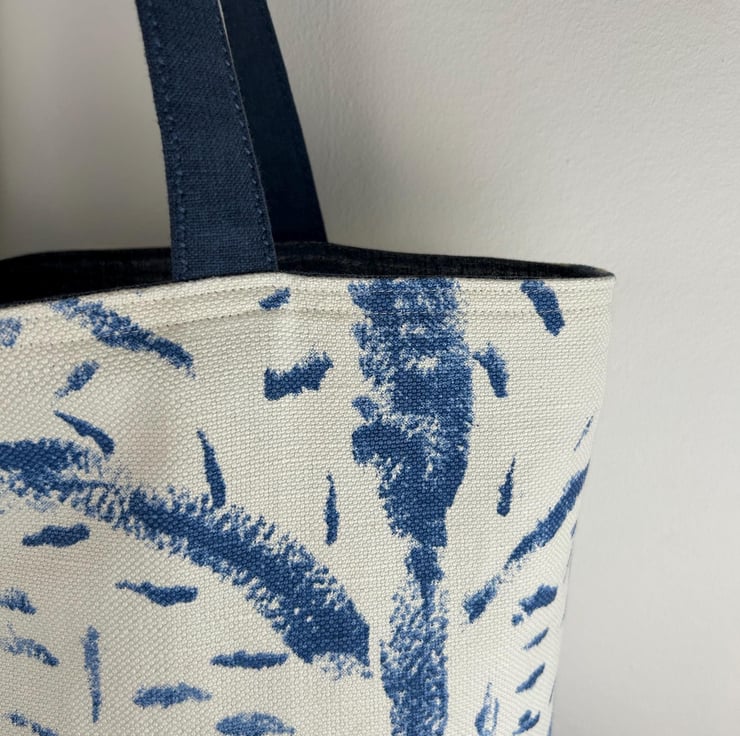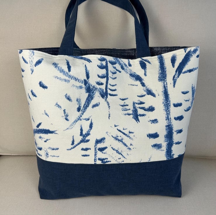 Beautiful cotton canvas tote with blue brushstroke pattern. The bottom of this bag and the handles are in dark blue heavyweight cotton. The bag is fully lined in a bluesilver cotton mix fabric and the corners are boxed to give it shape and additional capacity.