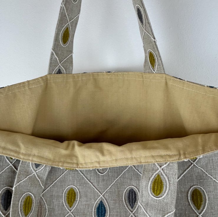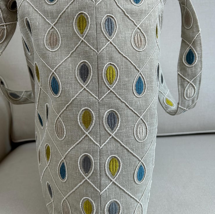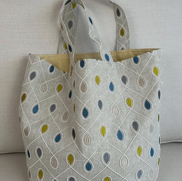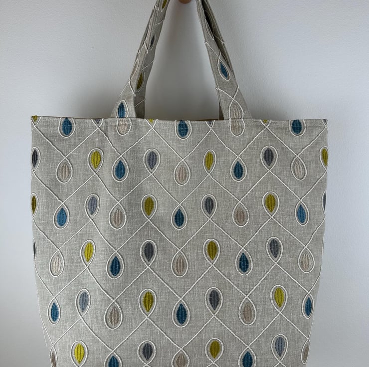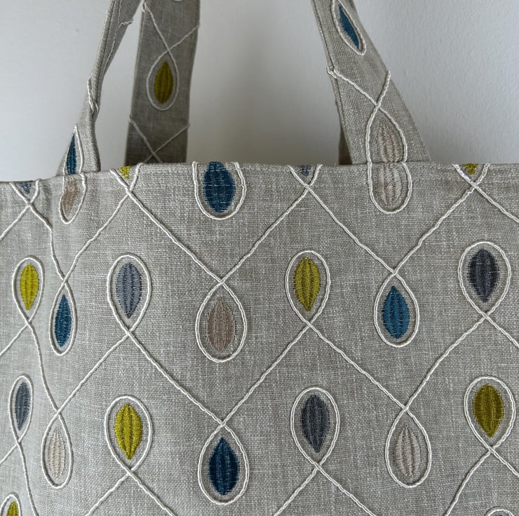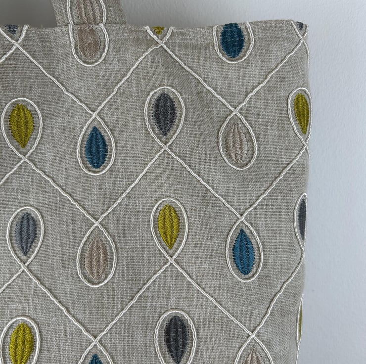 It features a geometric design in the colours lime, aqua and duck egg on a neutral background. The fabric is a polyester cotton mix and the embroidery is cotton. This bag is fully lined in cotton and the corners are boxed to give it shape. A beautiful bag to carry by hand.