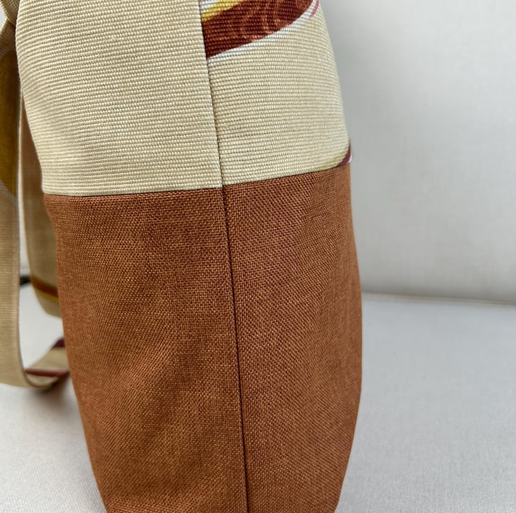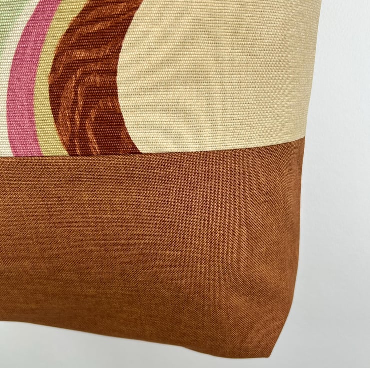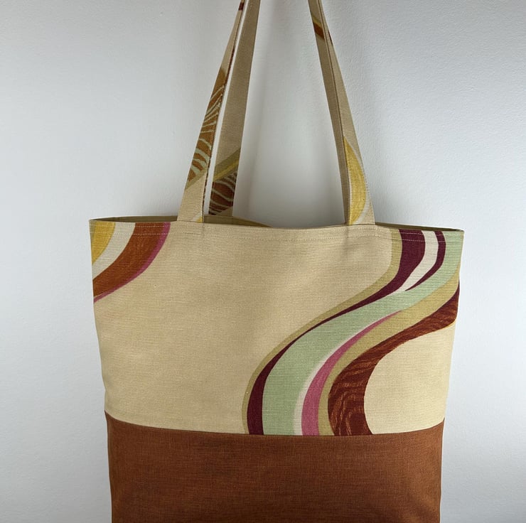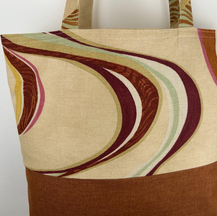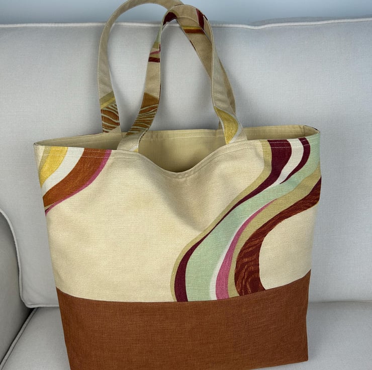 This large tote features a beautiful abstract swirl pattern in earthy tones. The fabric is cotton canvas and the bottom of the bag is a rust brown upholstery fabric. Tote is fully lined in a complementary light coloured heavy cotton.