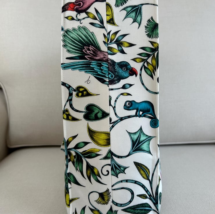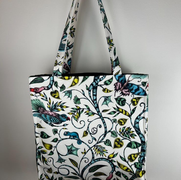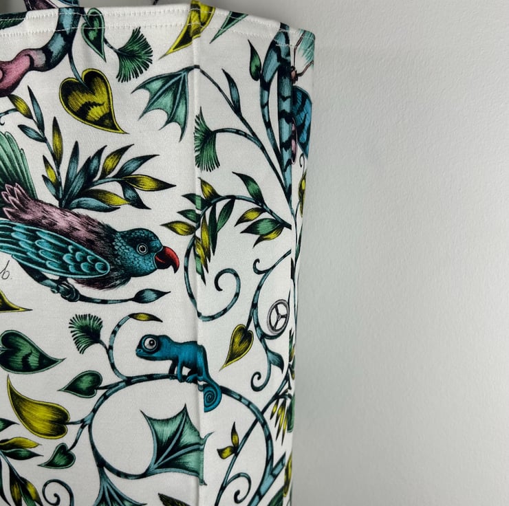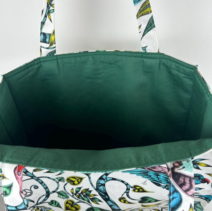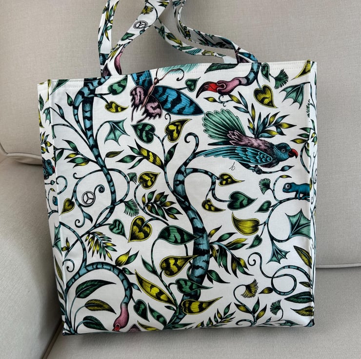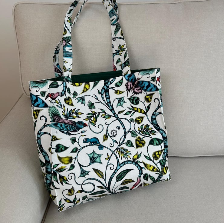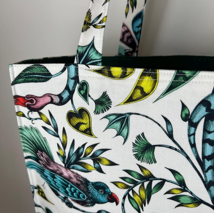 Tote in a lively and whimsical nature-inspired 100% cotton satin. The design features intertwining vines in shades of green , blue and yellow on a white background, creating a lush, botanical feel. Among the foliage are beautifully detailed birds, butterflies and other small creatures, adding a playful and enchanting touch. This bag is fully lined in dark green cotton and it is interfaced and boxed for shape.
