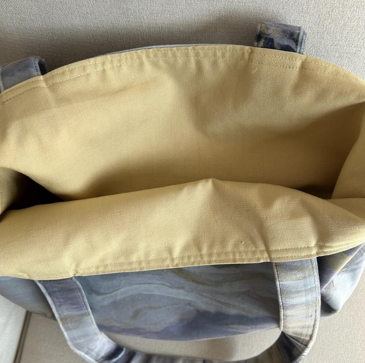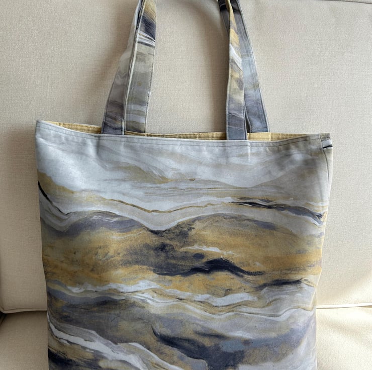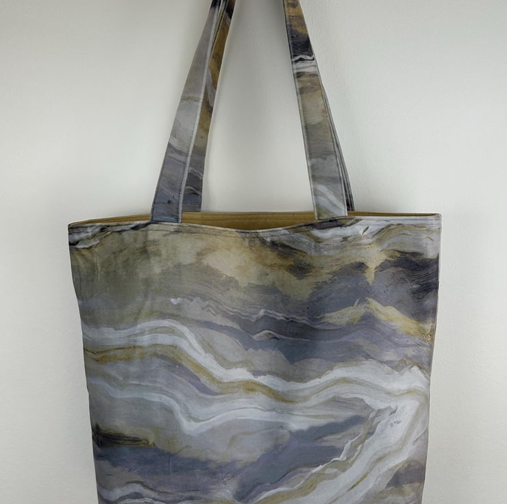 A beautiful long handled tote in a lovely soft velvet fabric with distinct abstract marble and mineral patterns. The bag is fully lined in a complementary cotton fabric.