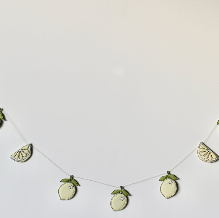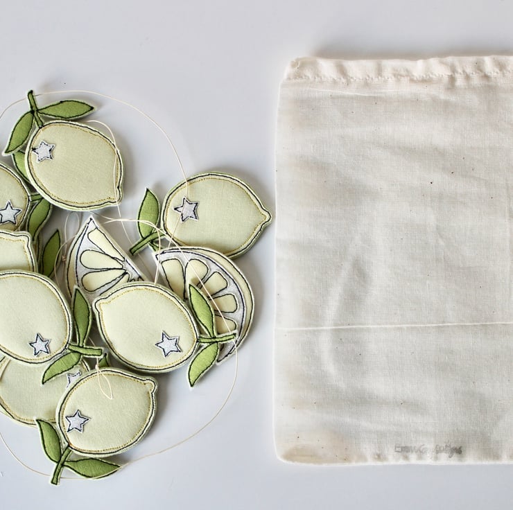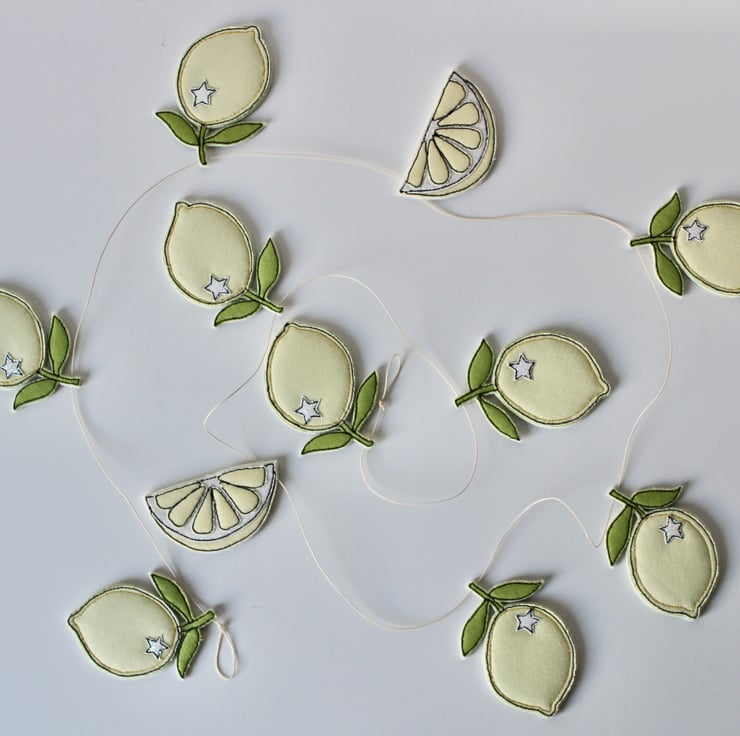 Each of the eleven lemons suspended along this garland, are sewn using a combination of 100% wool felt, cotton cloth, glitter cloth and free hand machine embroidery; multiple layers of cloth are sewn together and cut out by hand using very sharp scissors.