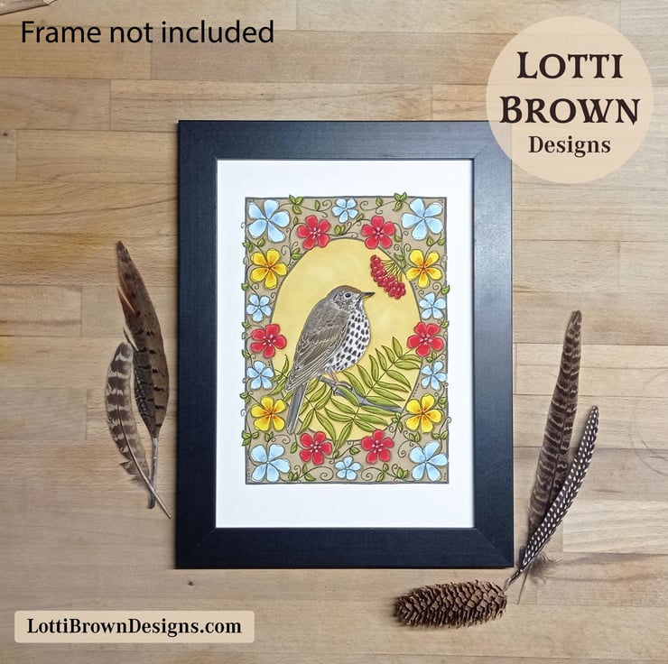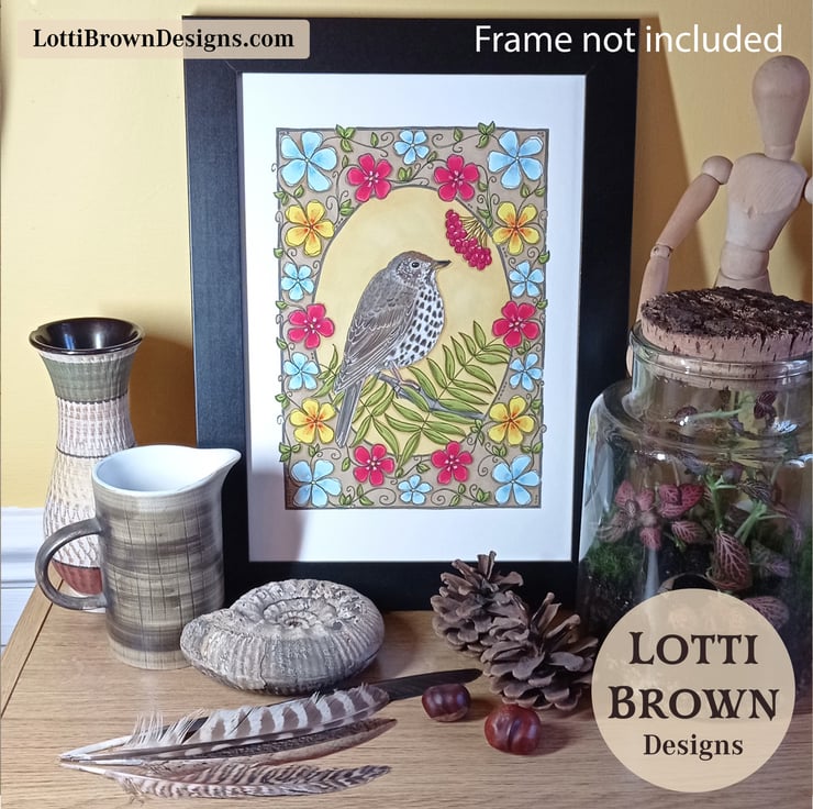 Fine art giclee print of my hand-drawn song thrush illustration.