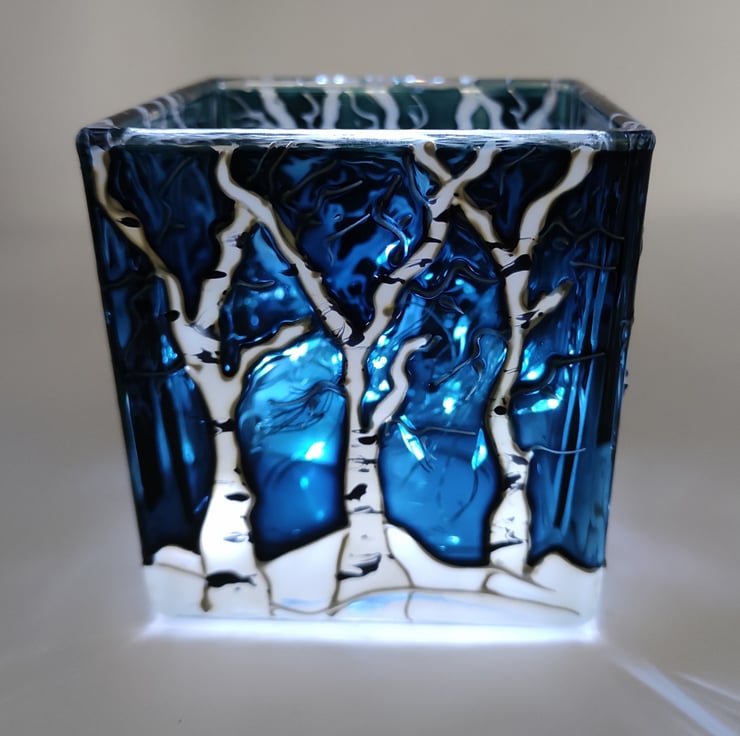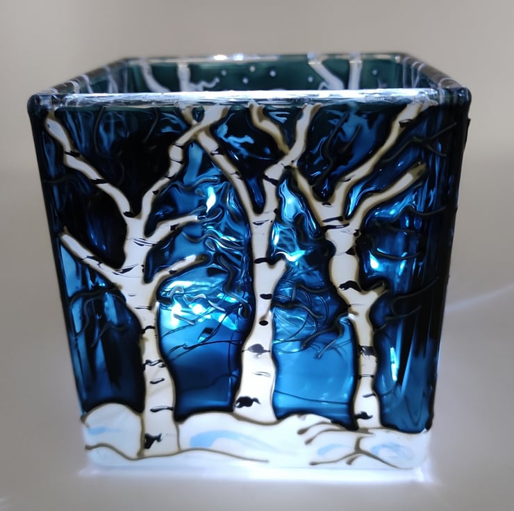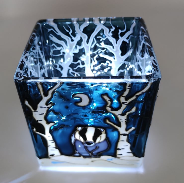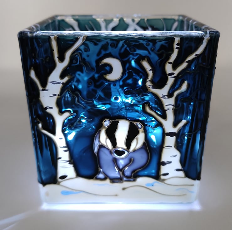 Hand painted glass candle holder, depicting a badger in the snow, in a birch wood under a moonlit winter night.