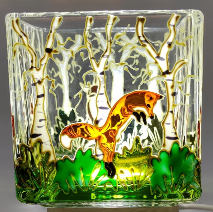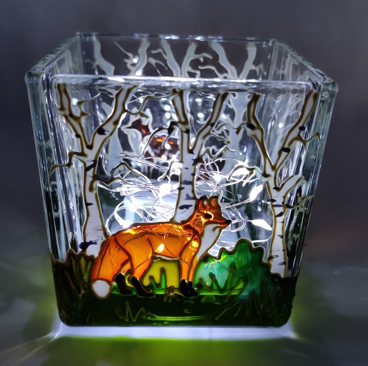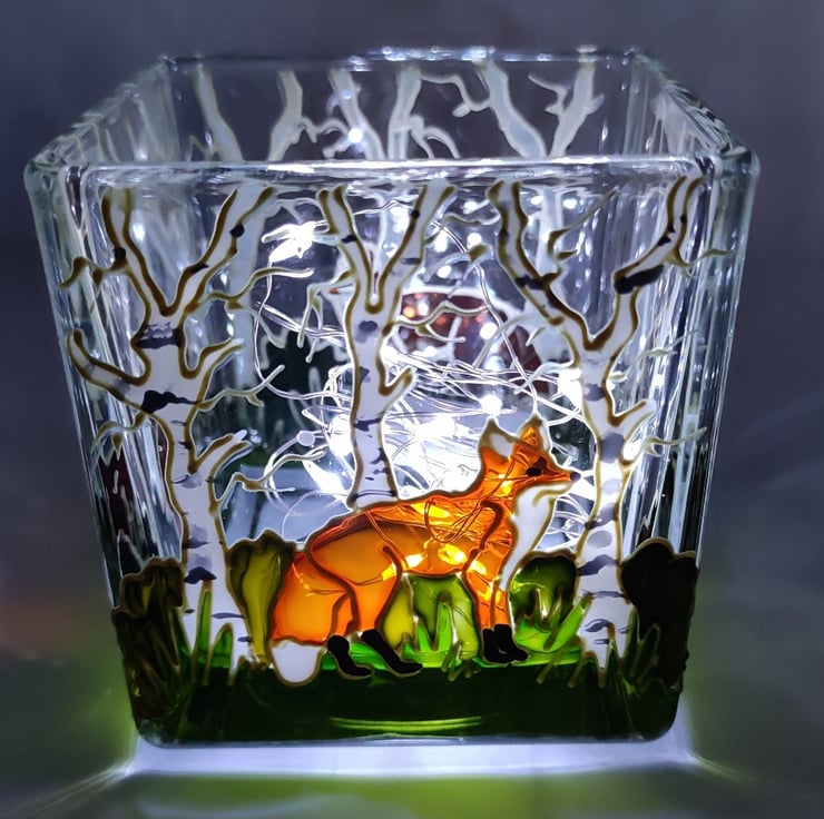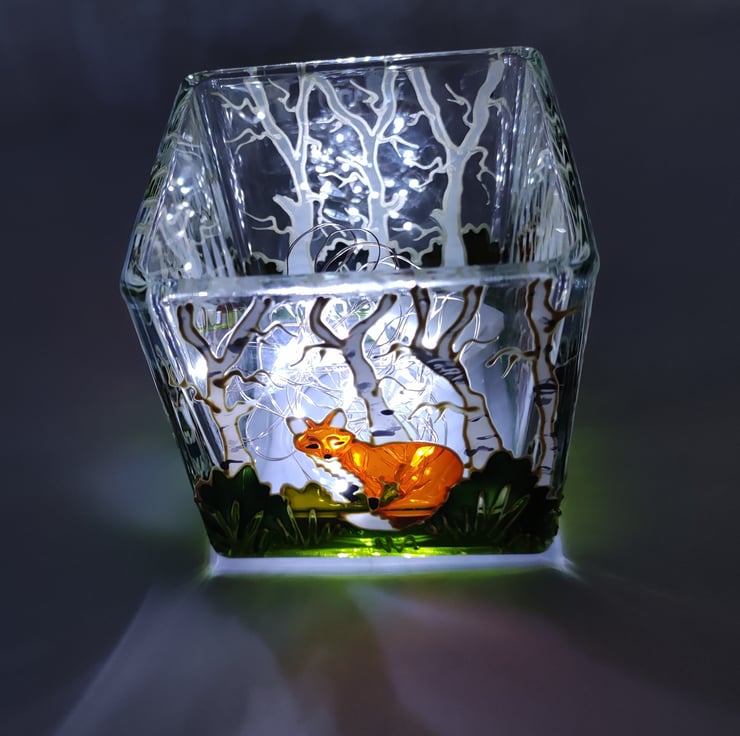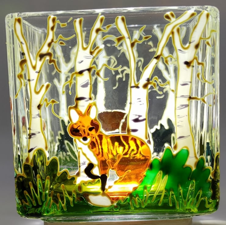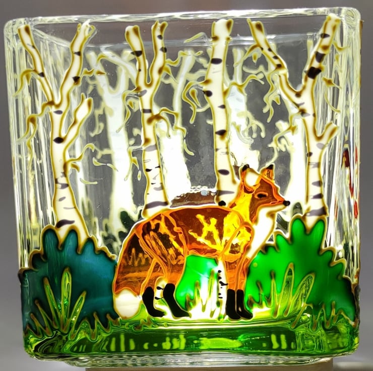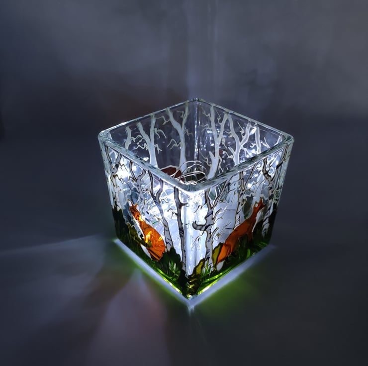 Glass candle holder, 7.5cm x 7.5cm, hand painted with a skulk of red foxes in birch woods